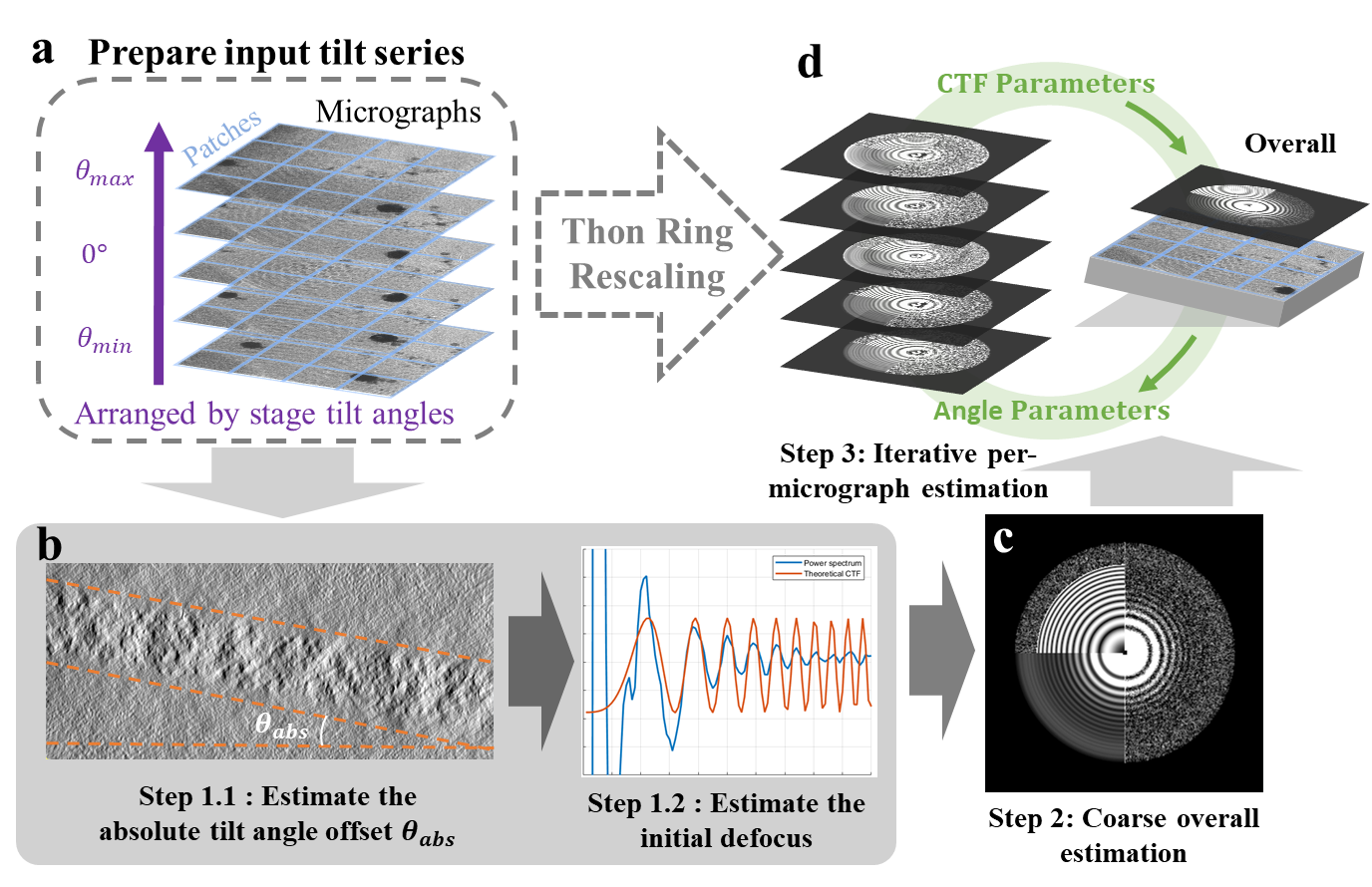 5月31日,AG(中国)AG·官方网页版生命科学学院李雪明副教授课题组和电子工程系沈渊教授课题组联合在《结构》(Structure)杂志在线发表研究论文,题目为“基于冷冻电子断层成像倾转系列照片的离焦量联合估计方法”(Tilt-series-based joint CTF estimation for cryo-electron tomography)。该论文报道了一种基于全部倾转系列照片的联合估计方法(图1)。该方法首先利用整套倾转系列数据来生成并估计整套数据的平均离焦量。其中通过引入一种尺度变换(Thonring rescaling)的方法,将不同离焦条件下的功率谱进行缩放,使其中的CTF衍射环能够被对齐并平均,从而获得高信噪比的平均功率谱。接下来,该方法依托平均离焦量作为初始值,对倾转系列中每张照片的离焦量进行局部估计优化,以提升单张照片的离焦量估计精度。在上述估计的过程中,该方法还包括了基于图像灰度均值的绝对倾角偏移估计方法,以及通过将离焦量与绝对倾角偏移和面外倾角(x-tilt)进行联合建模,在改善离焦量估计准确性的同时,实现对样品三维倾角的精确测量。