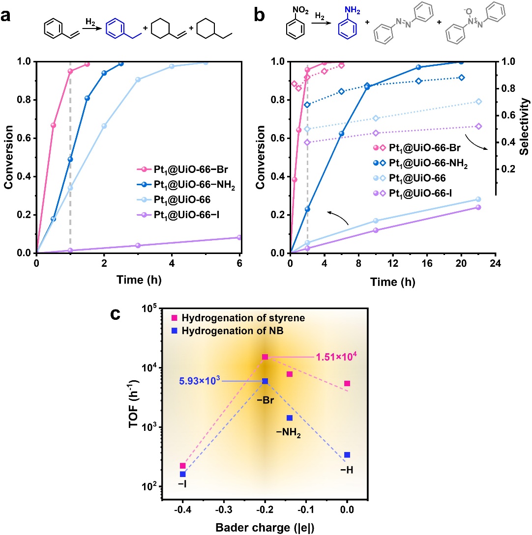 图3.Pt1@UiO-66−X (X =−Br,−NH2,−I, –H)苯乙烯和硝基苯加氢催化性能比较
