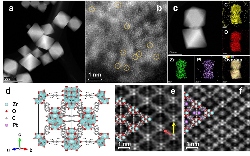 图2.负载铂单原子的UiO-66的扫描透射电子显微镜(STEM)图像