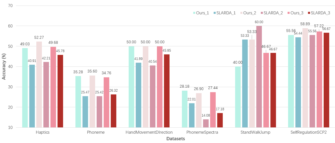 以能够自动适配最佳感受野的OS-CNN为基础分类器,研究团队在此基础上将存在样本缺乏且不存在类别不均衡等其他不利因素的难分类公开时间序列分类数据集作为目标域,并随机选取与之弱相关的时间序列分类数据集作为源域开展实验后可以发现,从弱相关时间序列分类数据集进行迁移的效果可能与从其他角度入手的深度学习分类方法、集成了多种统计学习方法的时间序列分类器达到相匹敌的准确度。此外,通过对现有的时间序列迁移学习架构进行增加尺寸变换等模块并将它们应用于弱相关时间序列分类任务间的迁移学习场景,并把得到的结果与所提架构进行比较,可以进一步论证本架构的有效性。