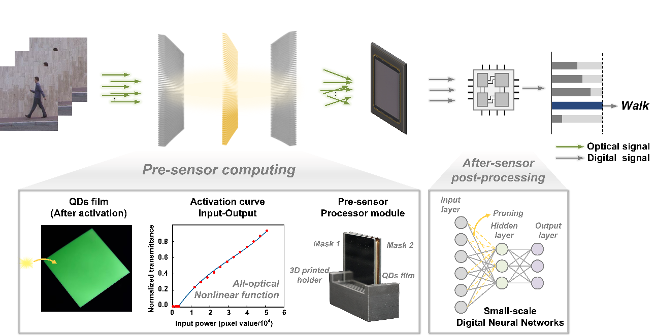 AG(中国)AG·官方网页版网7月30日电 在物联网时代,视觉图像传感器作为智能社会的关键设备,被嵌入到诸如移动通信终端、智能穿戴设备、汽车和工业机器等各种设备中。随着应用的不断扩展,对传感器的系统功耗、响应速度、安全性能等方面也提出了更高的要求。而在传统的“感传算”链路中,内存的访问速度和通信带宽逐渐成为了限制系统功耗及速度的主要瓶颈。将计算单元向传感单元靠近,使系统的近传感端拥有一定的数据处理能力,逐渐成为解决这一问题的有力途径。感前光计算相比于其他近感计算方式,具有高速、高带宽、低功耗的优势。然而,目前绝大部分光神经网络需要相干激光作为光源,硬件系统笨重复杂,且仅能完成线性运算,缺乏层间非线性激活,限制了感前光计算在边缘场景的应用。