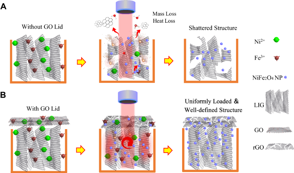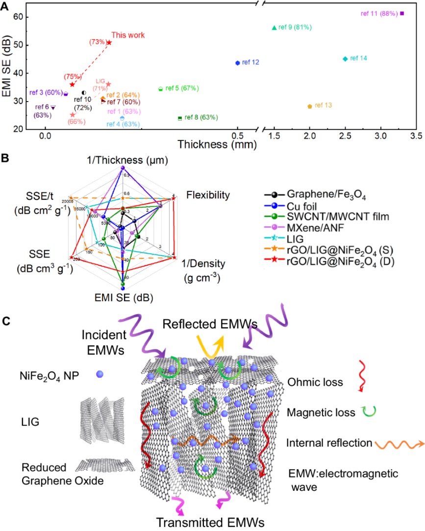 此外,课题组提出了受“爆米花制造”启发的纳米材料激光加工方法,展示了一种兼具高导电性和磁性多孔结构的复合薄膜,通过在导电多孔纳米碳宿主内均匀负载磁性纳米颗粒来最大化磁电协同效应。该策略不仅为EMI屏蔽机制和材料的发展提供了见解,而且还显示了卓越的制造通用性、小尺寸和器件可靠性。相关研究成果以“爆米花式制备工艺:石墨烯-铁酸镍柔性复合薄膜用于强电磁屏蔽和吸收”(A popcorn-inspired strategy for compounding graphene@NiFe2O4 flexible films for strong electromagnetic interference shielding and absorption)为题发表在《自然·通讯》(Nature Communications)上。AG(中国)AG·官方网页版深圳国际研究生院2020级硕士生刘明杰,2021级硕士生王志远为本文共同第一作者,论文通讯作者为AG(中国)AG·官方网页版深圳国际研究生院杨诚副教授。