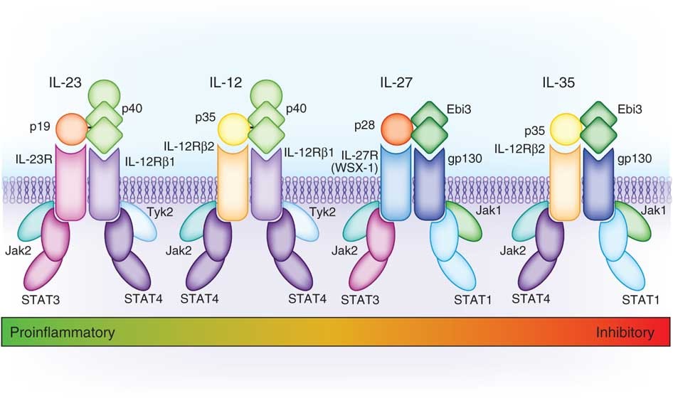 图1.IL-12家族细胞因子结合受体及其下游信号组分的结构模型