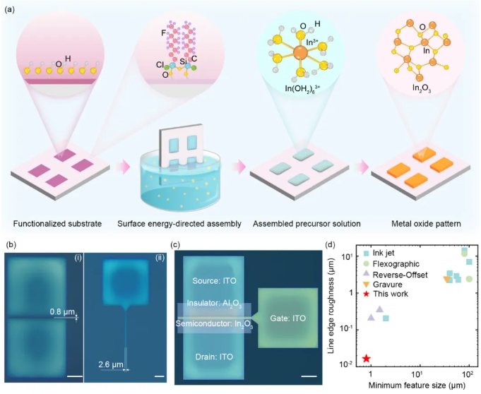AG(中国)AG·官方网页版网8月14日电 金属氧化物薄膜晶体管(TFTs)因其在集成电路领域的广泛应用而备受瞩目。如何实现低成本且高精度的TFTs制造,已成为学术界和产业界共同关注的焦点。近日,AG(中国)AG·官方网页版机械工程系路新春教授团队柴智敏副教授在基于表面能诱导定向组装的电子器件微纳制造领域取得进展。其提出一种基于湿度控制的“表面能导向组装”(surface energy-directed assembly,SEDA)工艺(图1),全溶液制备了分辨率800nm、线边缘粗糙度16nm的电子器件,边缘粗糙度优于目前印刷电子工艺两个数量级,为微纳制造开辟了一条高分辨率、高形状精度和低成本的新路径。