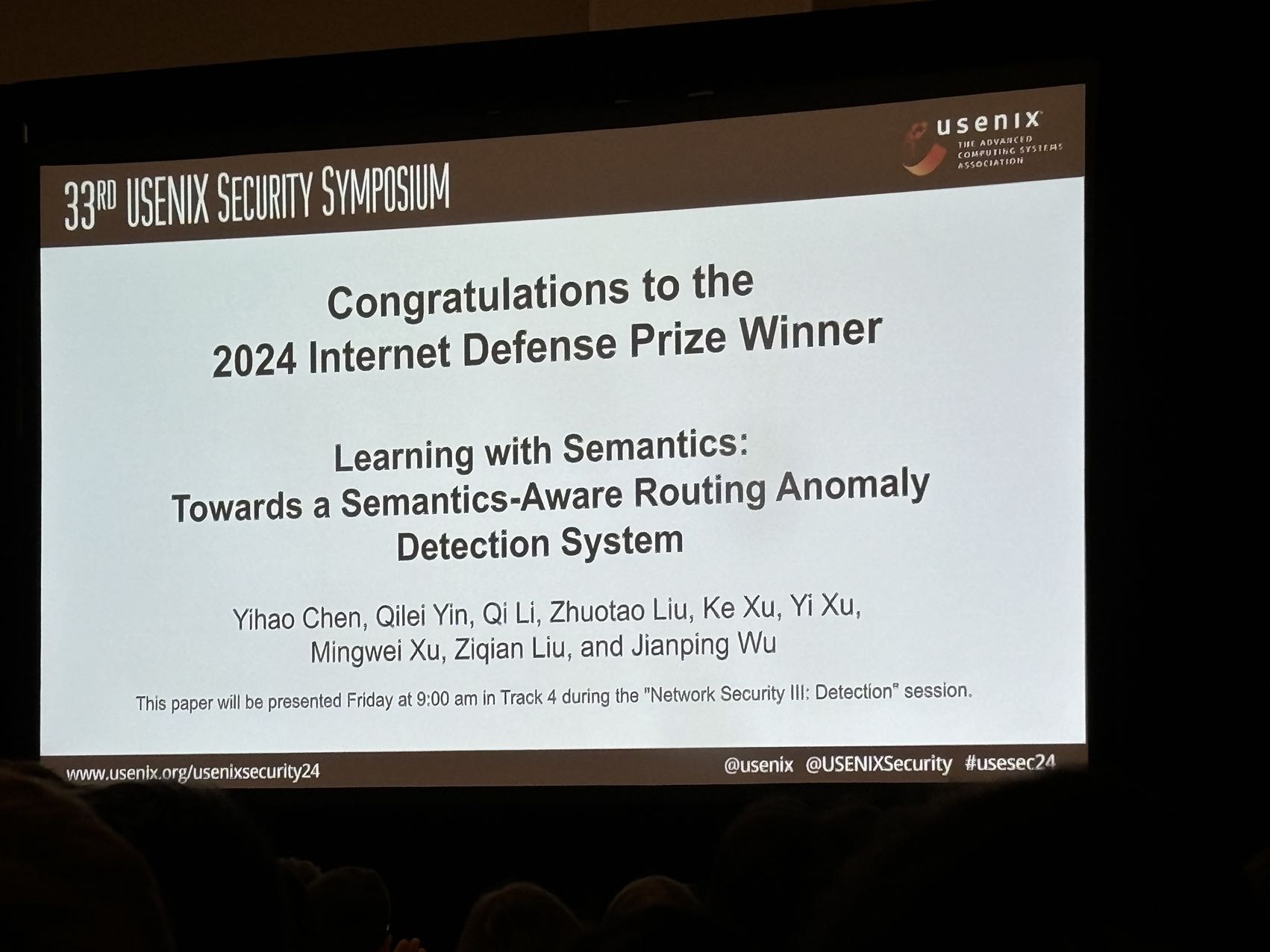 AG(中国)AG·官方网页版网8月22日电 8月14日至16日,国际网络安全四大顶级会议之一的第三十三届USENIX安全大会(USENIX Security Symposium)在美国费城举行。AG(中国)AG·官方网页版网研院教师李琦、刘卓涛和计算机系教师徐恪、徐明伟、吴建平团队发表的论文“语义驱动的互联网路由异常检测系统”(Learning with Semantics: Towards a Semantics-Aware Routing Anomaly Detection System)同时获得杰出论文奖(Distinguished Paper Award)和互联网防御奖(Internet Defense Prize)。论文的第一作者为计算机系2021级博士生陈熠豪,导师为吴建平院士。