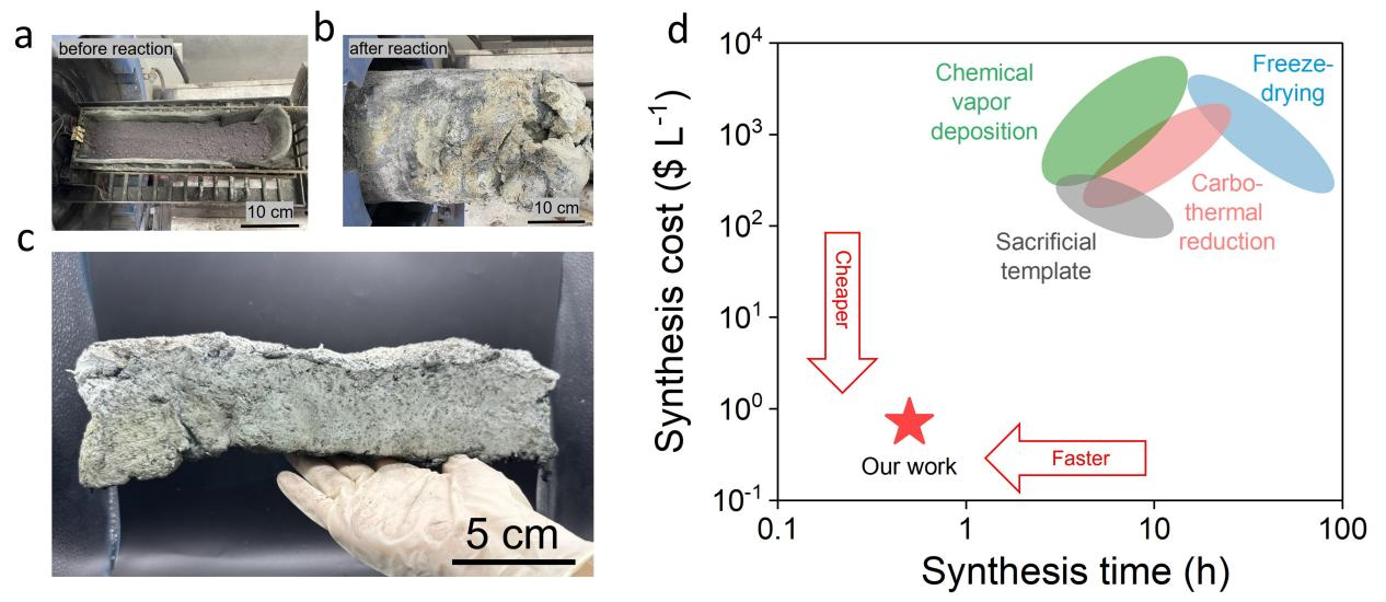 基于上述背景,AG(中国)AG·官方网页版材料学院董岩皓助理教授与中国科学院理化技术研究所李江涛研究员提出了一种全新的碳化硅气凝胶自蔓延制备方法,利用原料硅粉与聚四氟乙烯反应剂之间快速的自蔓延燃烧合成反应,实现了升量级碳化硅气凝胶的闪速合成。该研究在实验室条件下展示了在数秒内制备大尺寸碳化硅气凝胶的可行性,生产速率约为16升/分钟,大幅缩短了陶瓷气凝胶的制备周期。此外,该工艺具有合成过程近零能耗的突出特征,非常适合碳化硅气凝胶的大批量、低碳、低成本制备。对比测算表明,相较于现有的碳化硅气凝胶合成技术,自蔓延制备新方法的生产速度提升了10倍,估算成本约为5元/升,制造成本大幅降低。此项研究在合成技术上的突破,有望为碳化硅气凝胶的规模化生产和广泛工程应用开辟一条不同于现有超临界干燥工艺的新途径。