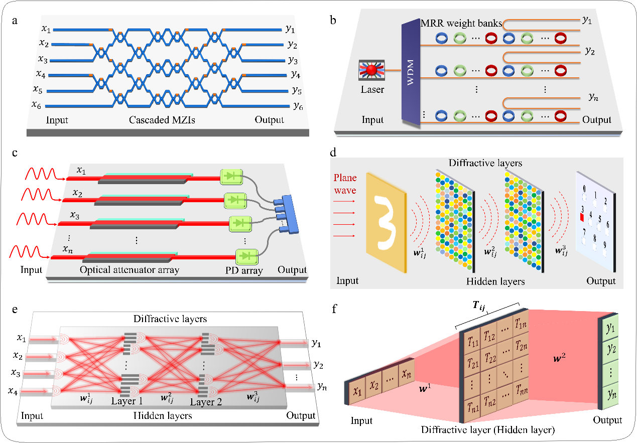 图2.用于实现光学神经网络功能的不同光学元器件及系统