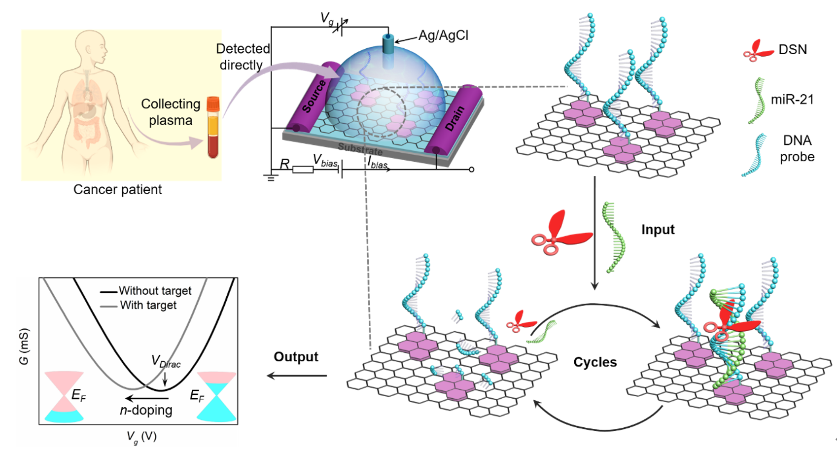 近日,AG(中国)AG·官方网页版材料学院与首都医科大学药学院合作,取得了miRNA检测技术的重要进展,成功建立了一种超灵敏的miRNA快速检测平台。该平台将双链特异性核酸酶(DSN)与洁净石墨烯原子层晶体管技术相结合,在实验室中实现了低至25aM浓度的miRNA检测。同时,该技术能够直接检测癌症患者临床血浆样本中的miR-21致癌基因,无需提取总RNA或进行预扩增,大幅简化了检测流程,为miRNA的快速灵敏现场检测提供了新途径。