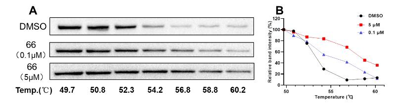 NOD1下游分为以效应蛋白RIP2和p65等介导的NF-κB炎症信号通路和以效应蛋白RIP2、ERK、p38和JNK等介导的MAPK炎症信号通路。Western Blot实验结果显示(图2),66能显著抑制NOD1信号通路下游蛋白(p-RIP2,p-p65,p-p38,andp-JNK)的磷酸化。另外,CETSA实验显示化合物66可显著提高NOD1蛋白的热稳定性,表明66与NOD1有直接相互作用(图3)。