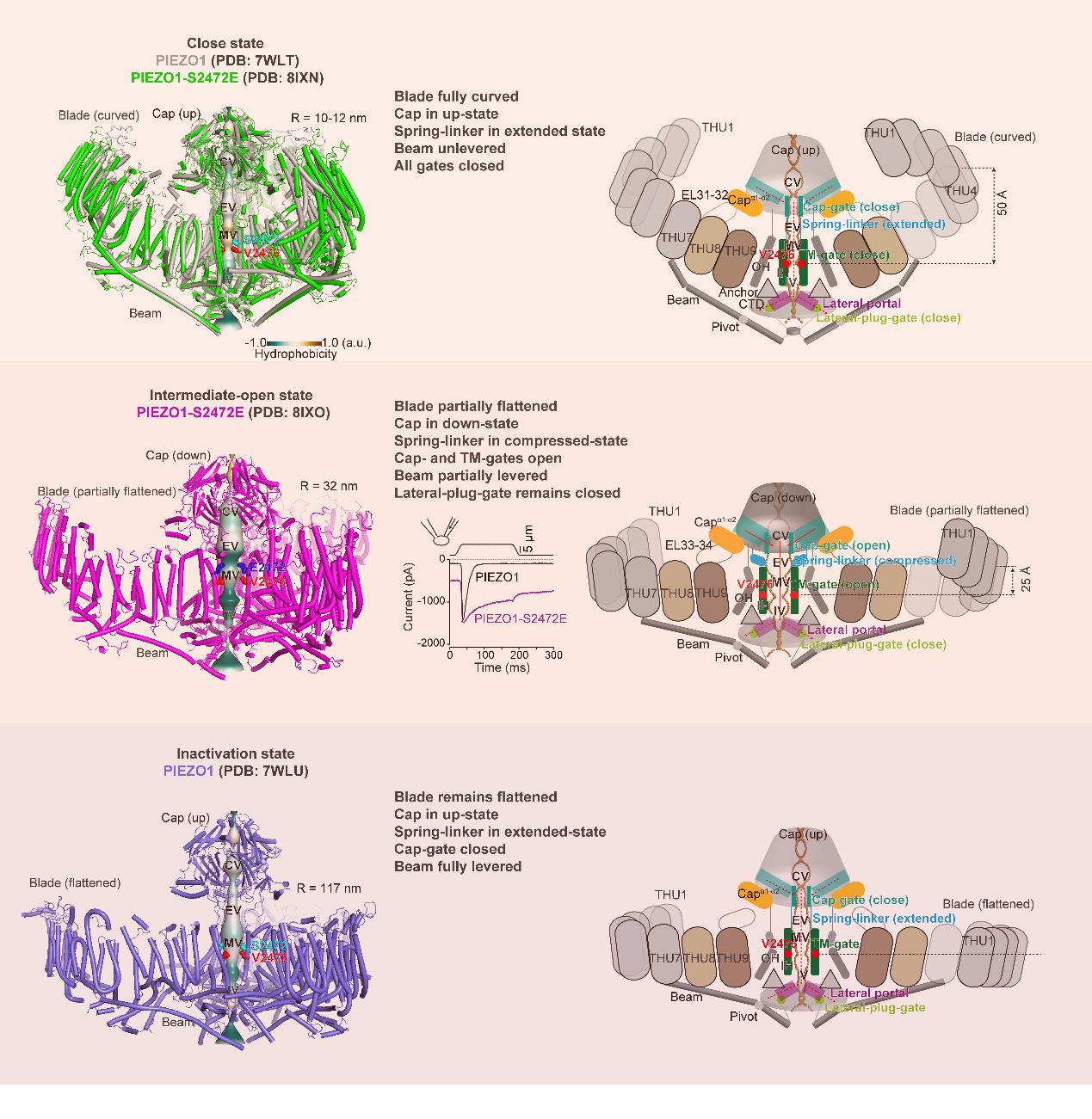 图1.PIEZO1关闭、中间开放与失活的结构机制示意图
