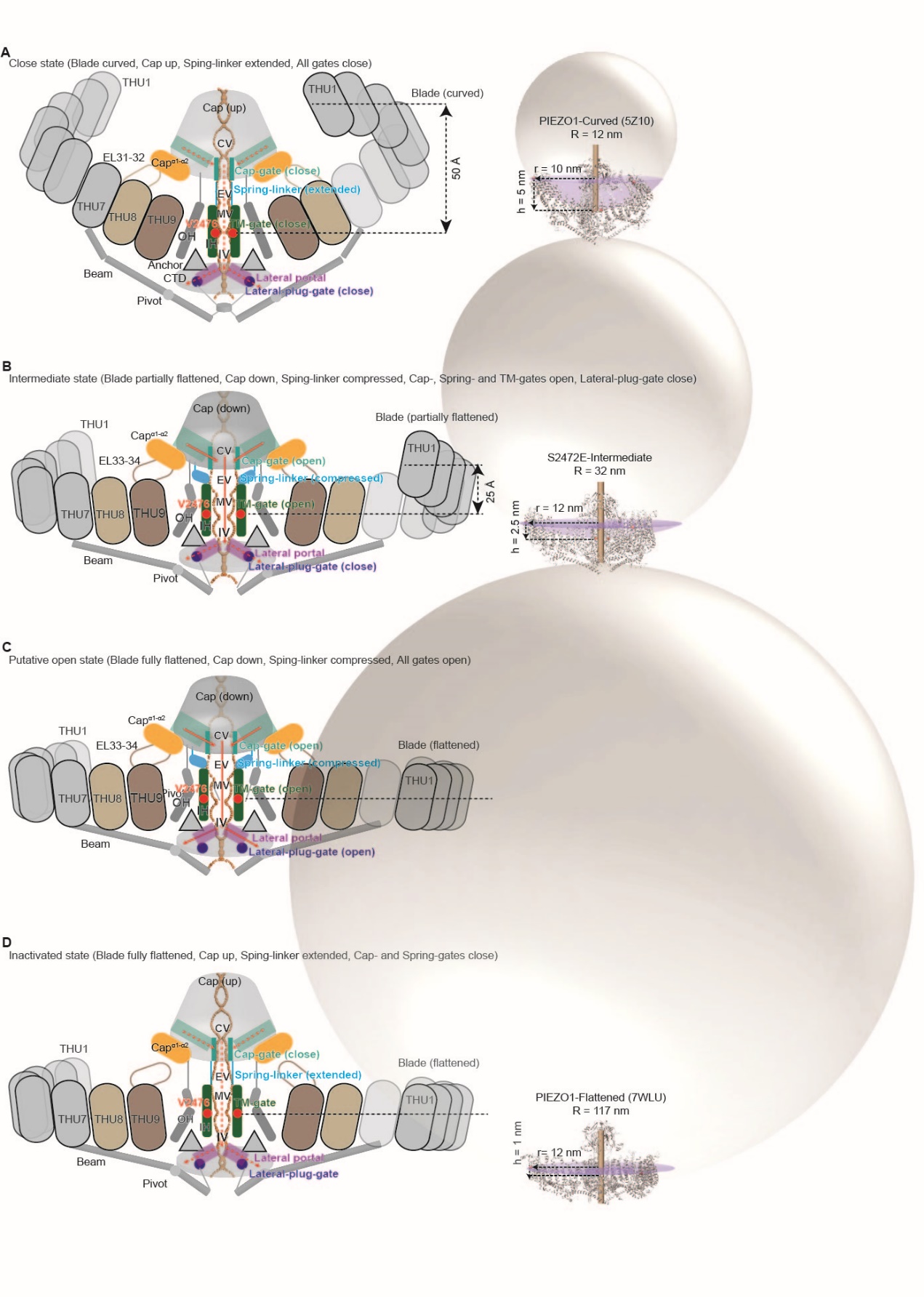 A.PIEZO1-Curved和S2472E-Curved结构代表PIEZO1的关闭状态,此时PIEZO1桨叶区呈高度弯曲状,PIEZO1纳米碗曲率半径约为10至14nm,帽子在向上位置且全部门控位点关闭。
