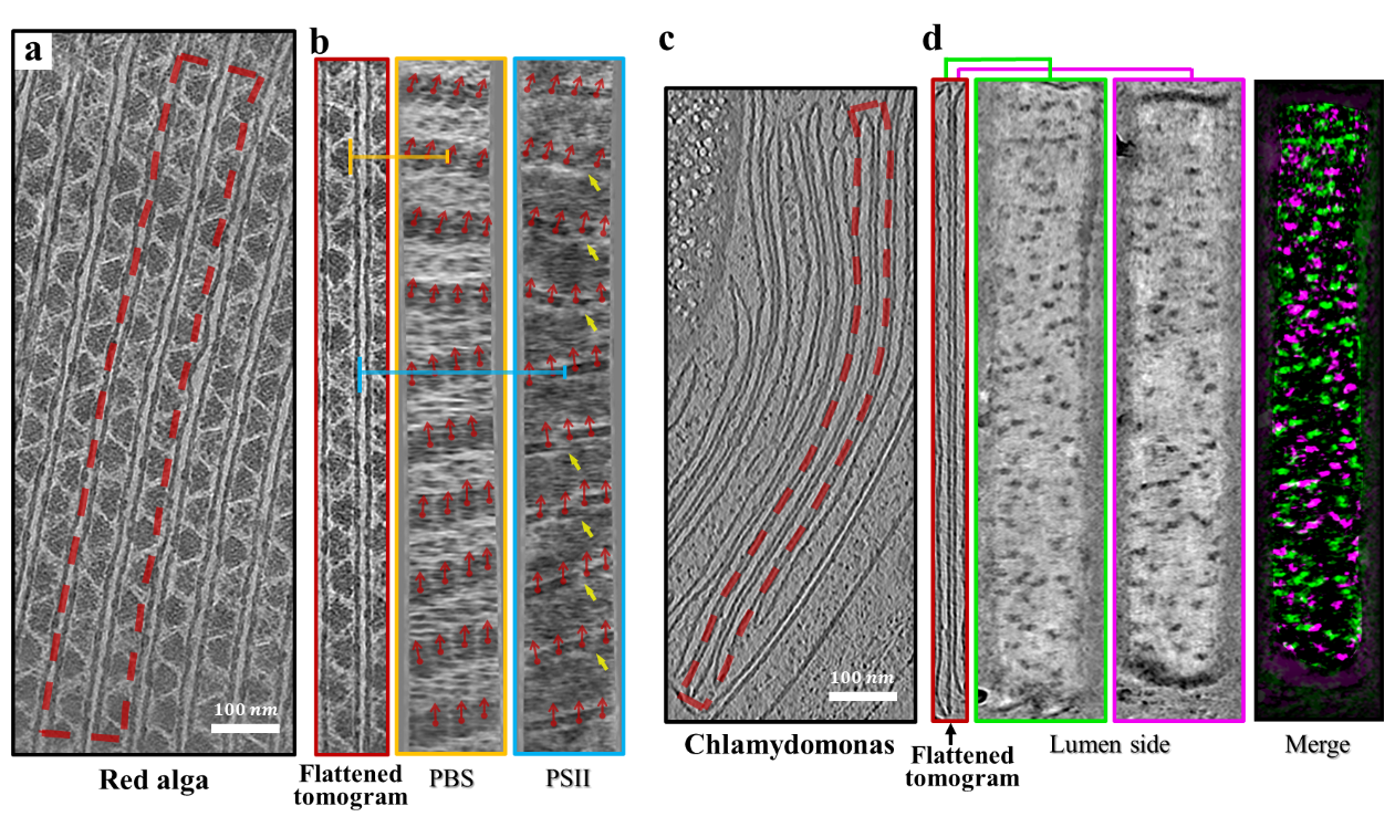 MPicker还可以提供每个颗粒的初始取向用于辅助膜蛋白STA的计算。除了常规的膜法向量,用户还可以方便地通过MPicker在展平tomogram中标注蛋白在膜表面的面内取向,从而利用更强的角度约束来辅助STA的计算。为提高取向确定的自动化程度,研究团队将膜蛋白沿膜法向量投影,并进行了改造的二维分类,从而更高效地获得每个颗粒的精准取向信息。通过这一方法,团队使用四套tomogram数据成功解析了衣藻PSII-LHCII超复合物的低分辨原位结构(图3),并将结果上传至EMDB数据库(EMD-61019)。