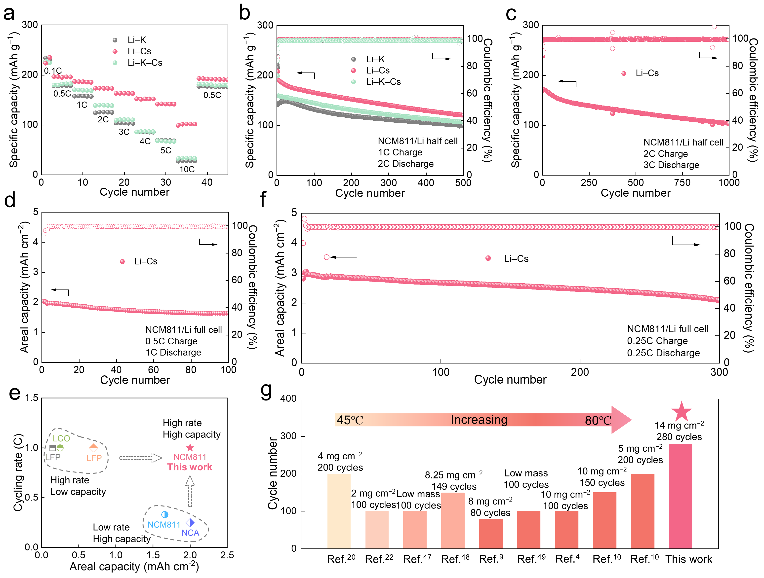 图2.使用熔盐电解质的锂金属电池的电化学性能