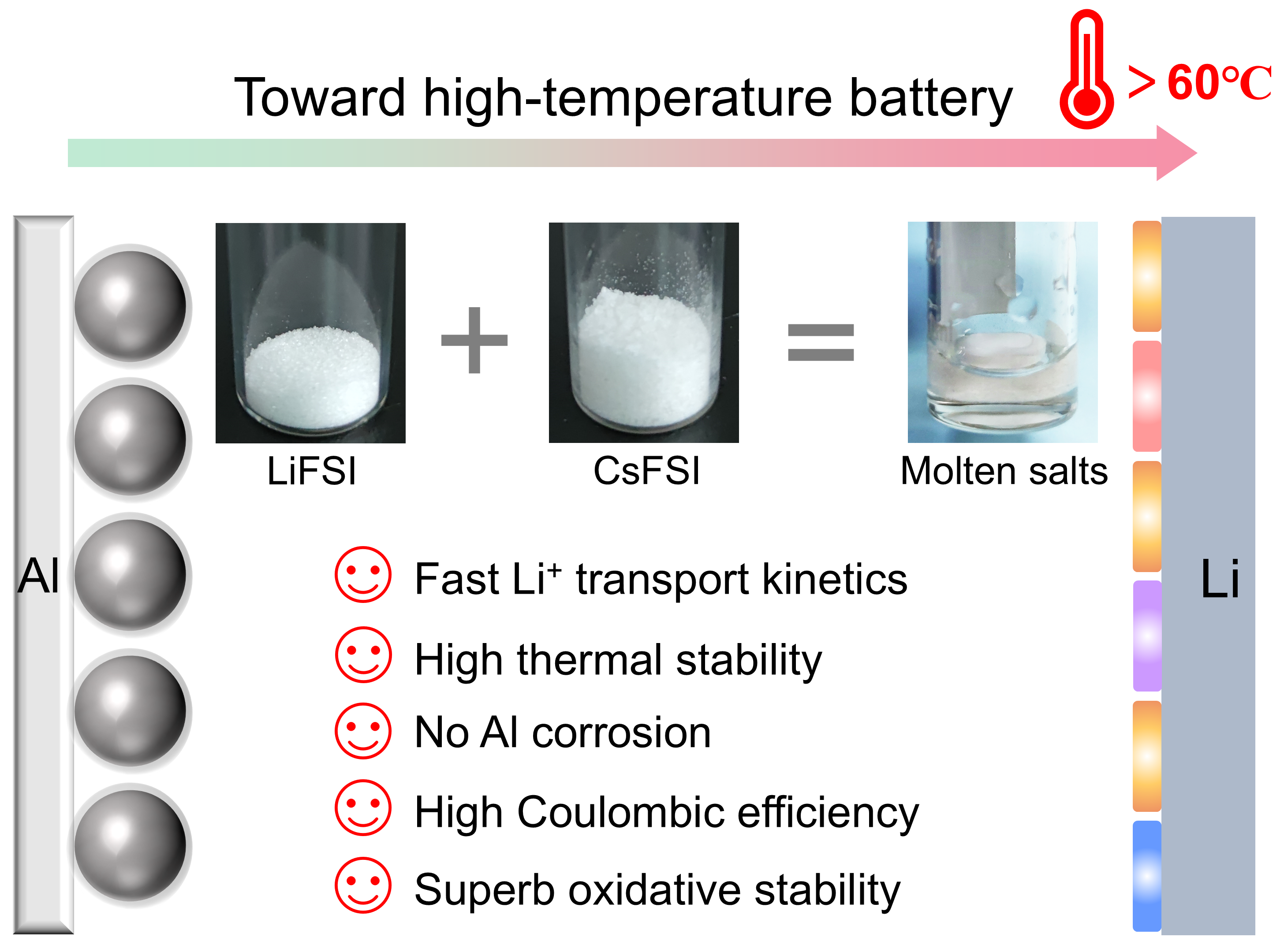 图1.一种用于高温锂金属电池的无溶剂熔融盐电解质,具有增强的Li+传输动力学。阳离子协同效应和富含无机的固态电解质界面赋予了其快充性能和长期循环稳定性。