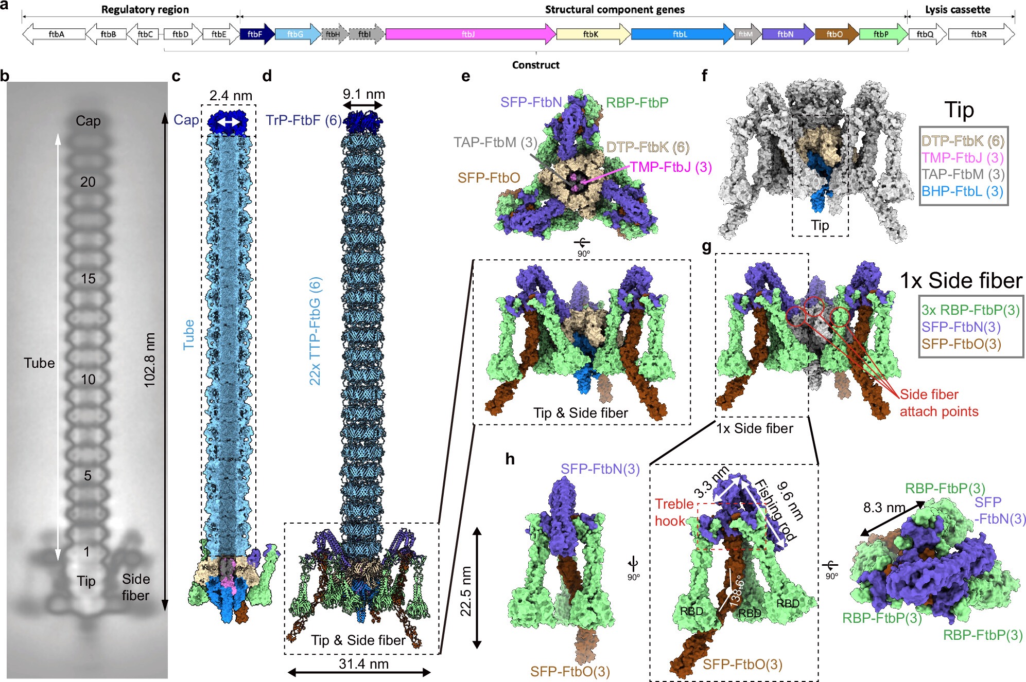 Monocin全长约103纳米,由22个六聚体环状主要尾部蛋白(TTP-FtbG)螺旋状堆叠形成柔性管状核心,相邻环的FtbG由二硫键连接。尾管近侧由终止蛋白(TrP-FtbF)六聚体封闭形成帽区,远侧则由基板枢纽蛋白(BHP-FtbL)三聚体封闭并形成尾刺,并通过远侧尖端蛋白(DTP-FtbK)三聚体连接的“钓竿-三钩”复合体(FtbN三聚体)与侧纤维结合。