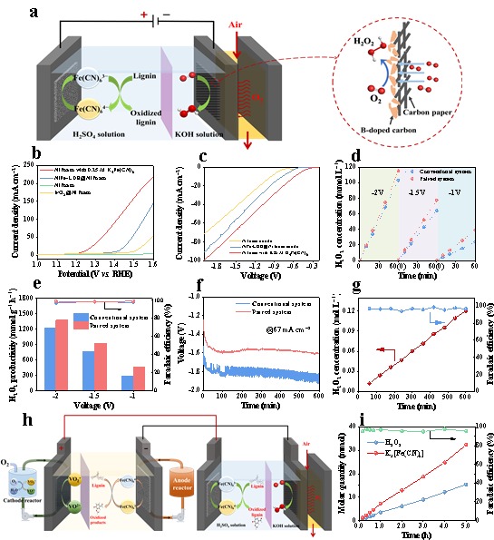 图2.木质素为电子供体的过氧化氢电化学合成耦合系统及其电化学性能