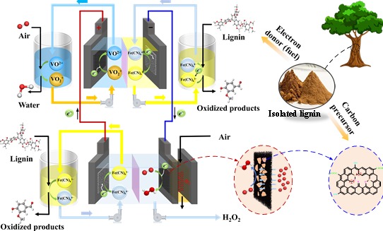 图1.以空气为氧源、木质素为绿色碳基前体和电子供体的过氧化氢电化学合成新体系