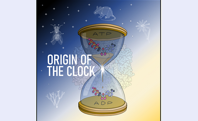 这个ATP酶驱动的沙漏隐喻了极慢的水解酶动力学决定了振荡的速度,促成了24小时的昼夜节律。背景中组成六聚体的RUVBL2是真菌、果蝇、植物和小鼠生物钟系统中的共同起源分子。