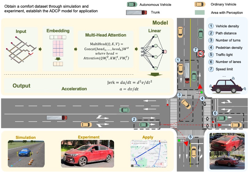 为解决这一问题,研究团队提出了基于多头注意力机制与XG Boost的ADCP模型,实现从道路信息到宏观舒适性指标的预测。通过真实车辆数据采集与仿真结合,构建了全球首个“道路信息-舒适性”数据集,量化了道路特征(如拥堵程度、道路宽度、路口数量等)与舒适性指标(如加速度变化率等)的关联性。同时,研究结合乘员主观感受提出综合评价方法,验证了模型的有效性,综合评价效果提升13%。