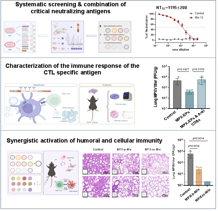 3月26日,程功教授团队与合作者在《自然·通讯》(Nature Communications)发表“一种针对猴痘病毒的mRNA疫苗可通过协同激活体液和细胞免疫反应抑制感染”(An mRNA vaccine against Monkeypox virus inhibits infection by co-activation of humoral and cellular immune responses)的研究成果。该研究基于mRNA疫苗技术,对猴痘病毒的细胞外包膜病毒(EVs)和细胞内成熟病毒(MVs)表面蛋白进行了系统筛选,最终确定了12种关键抗原,并通过不同组合(Mix-4、Mix-8、Mix-12)评估其免疫保护效力。结果表明,Mix-12能够诱导最强的免疫保护,抗原多样化可诱导宿主产生多样性强效中和抗体,对于提升疫苗免疫保护效果起到关键作用(图1)。