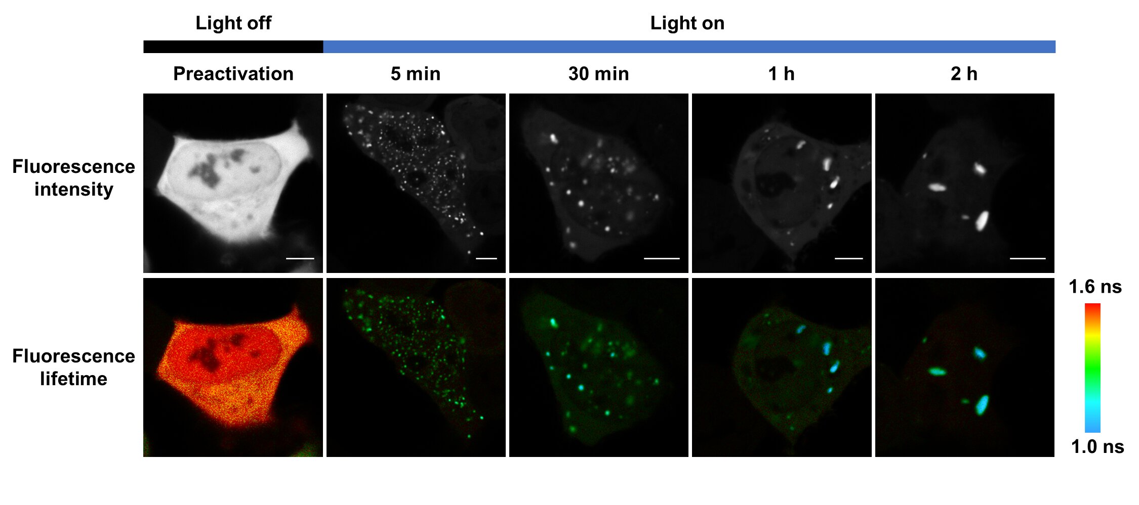 通过结合蓝光诱导相分离的optoDroplet系统,研究人员在活细胞内实现了对FUS蛋白凝聚体液-固相变过程的实时监测,验证了该技术在活细胞中的适用性。该研究为深入理解神经退行性疾病中蛋白质异常聚集的分子机制提供了强有力的研究工具(图3)。
