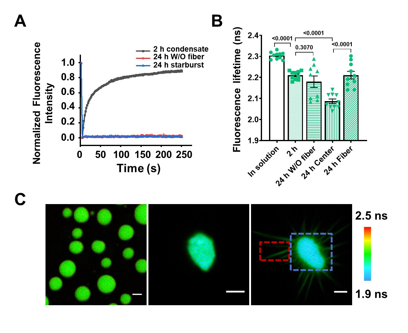研究人员通过GFP标记技术追踪FUS蛋白的相变过程,可以观察到随着蛋白凝聚体从液态向固态转变,GFP荧光寿命呈现明显的渐进式下降。该研究揭示了一个重要的分子特征:蛋白凝聚体流动性的变化可以通过荧光寿命这一指标进行精确监测。研究团队特别关注了FUS突变体G156E形成的独特“星爆”结构。通过FLIM成像分析发现,该结构的中心区域与外围纤维区域展现出截然不同的荧光寿命特征(图1)。后续结合透射电子显微镜和偏振光显微镜的联合分析证实,荧光寿命的差异很可能反映了两个区域在分子结构排列上的区别。