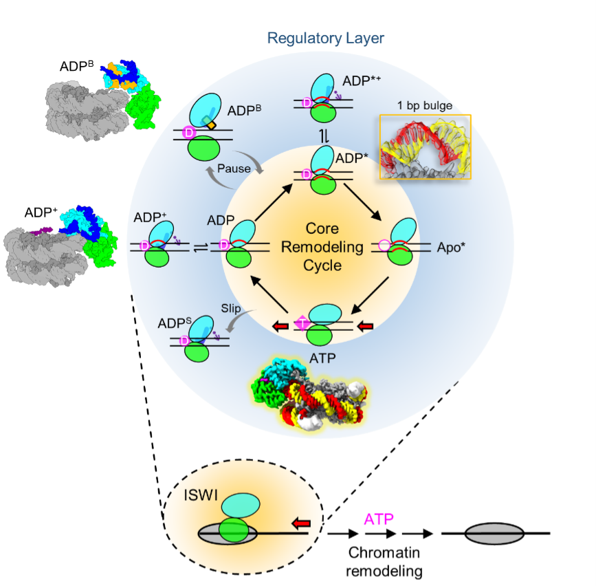 研究人员综合所获得的九种构像,提出一个多步骤染色质重塑模型,包括核心的重塑循环和外围的调控状态(图3)。在核心重塑循环中,ATP水解释放无机磷酸,马达经历ATP至ADP构像转变,并在SHL2位置引发1/2bp的DNA形变。马达蛋白进一步倾转,进入ADP*状态,引发1bp DNA隆起。随后,ADP*马达蛋白在整体构像不变的情况下释放ADP,进入Apo*状态。新一轮ATP结合促使马达蛋白闭合,马达的定向运动推动DNA链前移,防止DNA逆滑。同时,马达内部结构发生调整,释放与DNA链的紧密接触,使1bp DNA隆起向出口方向滑移,DNA恢复松弛状态。