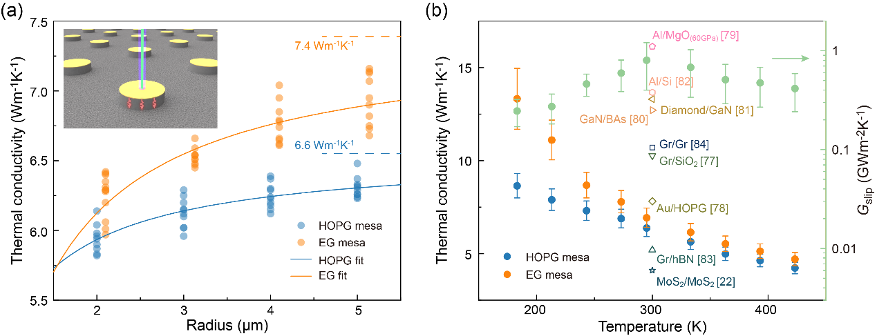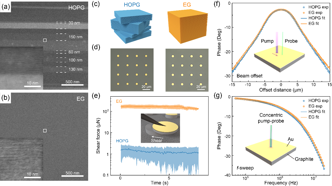 近日,AG(中国)AG·官方网页版航天航空学院郑泉水院士团队与北京大学宋柏研究员等团队合作,首次实现了对于石墨结构超滑界面的热输运测量。研究团队选用高定向热解石墨(HOPG)中天然存在的旋转界面作为研究对象(图1),通过结合微纳加工形成石墨岛的技术与频域热反射法(FDTR),实现了对超滑界面的力学特性与热输运性质的同步表征。该研究采取了两套研究方案。首先利用北京大学刘开辉教授团队外延生长的无转角界面的高质量外延单晶石墨(EG),准确测量了两种石墨样品的面外方向热导率。通过热导率差异推算出HOPG中多个结构超滑界面的热阻总体贡献并由此估算出单个界面的热导(图2)。