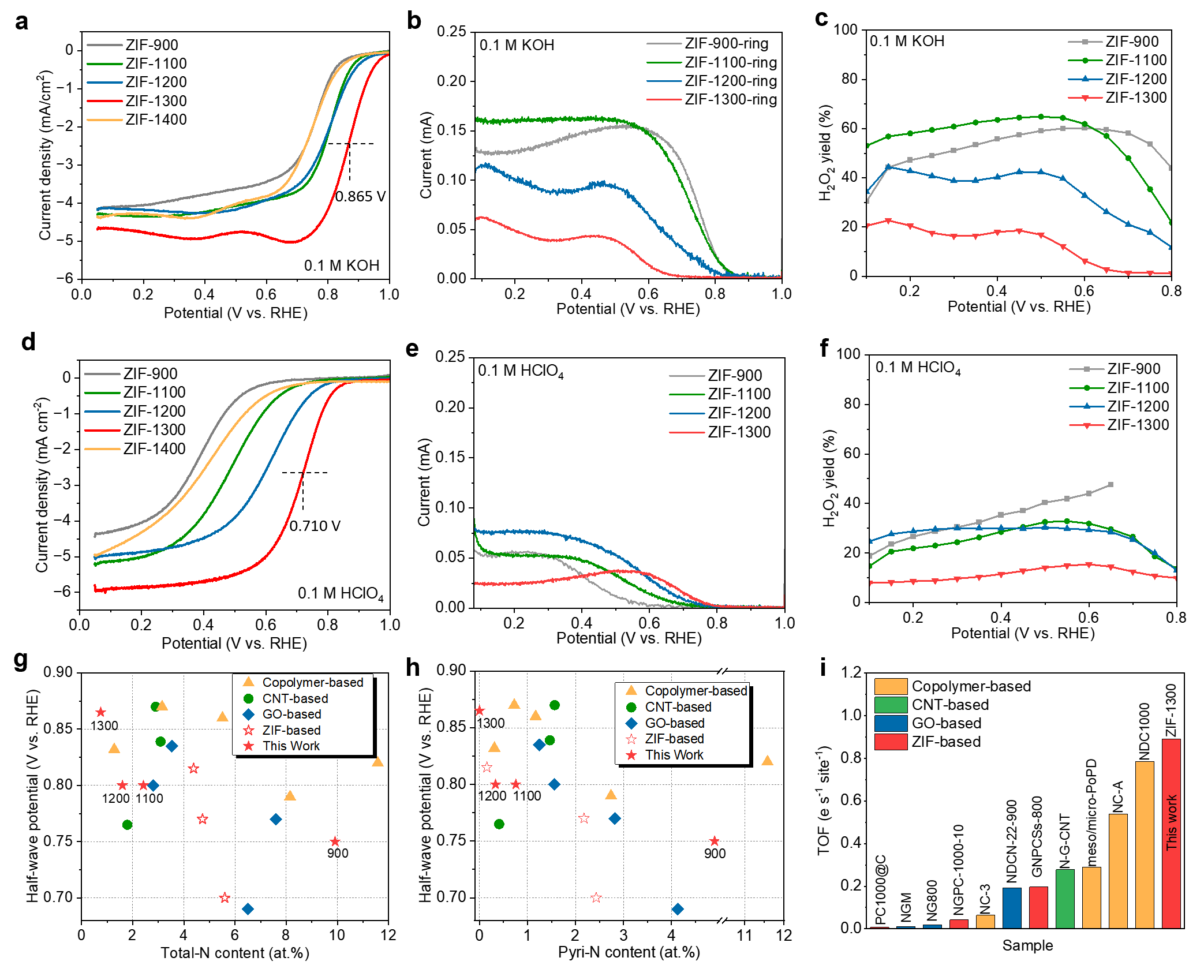 氧还原催化性能测试表明(图3),这种高温处理得到的五元环石墨氮掺杂碳材料(ZIF-1300)在碱性条件下ORR的半波电位达到0.865V,在酸性条件下为0.710V,在已报道的N–C催化剂中处于领先水平,同时表现出优异的四电子选择性。