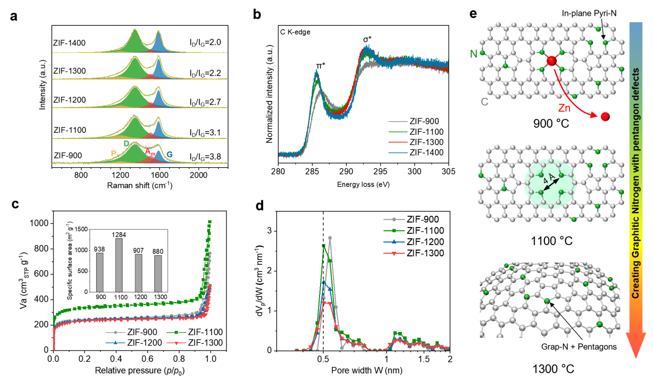 对此,研究团队采用ZIF作为前驱体,在高温热处理下通过愈合锌高温挥发产生的空位缺陷,实现了五元环石墨氮的高选择性合成,其石墨氮的相对比例接近100%。利用球差矫正扫描透射电子显微镜(STEM)积分差分相位衬度成像(iDPC)的高信噪比特性、结合X-射线光电子能谱(XPS)和电子能量损失谱(EELS)分析,在原子尺度上揭示了其五元环石墨氮结构(图1)。结合多种谱学方法进一步揭示了高温热解过程中这种五元环石墨氮的微观形成机制(图2):即Zn原子在900–1100˚C热处理时从Zn-N4平面挥发形成空位;Zn空位在更高的温度下(1300˚C)发生愈合,形成含有五元环石墨氮的球面石墨层,导致材料发生球形化;继续提高温度至1400˚C时,石墨氮的含量则显著降低。