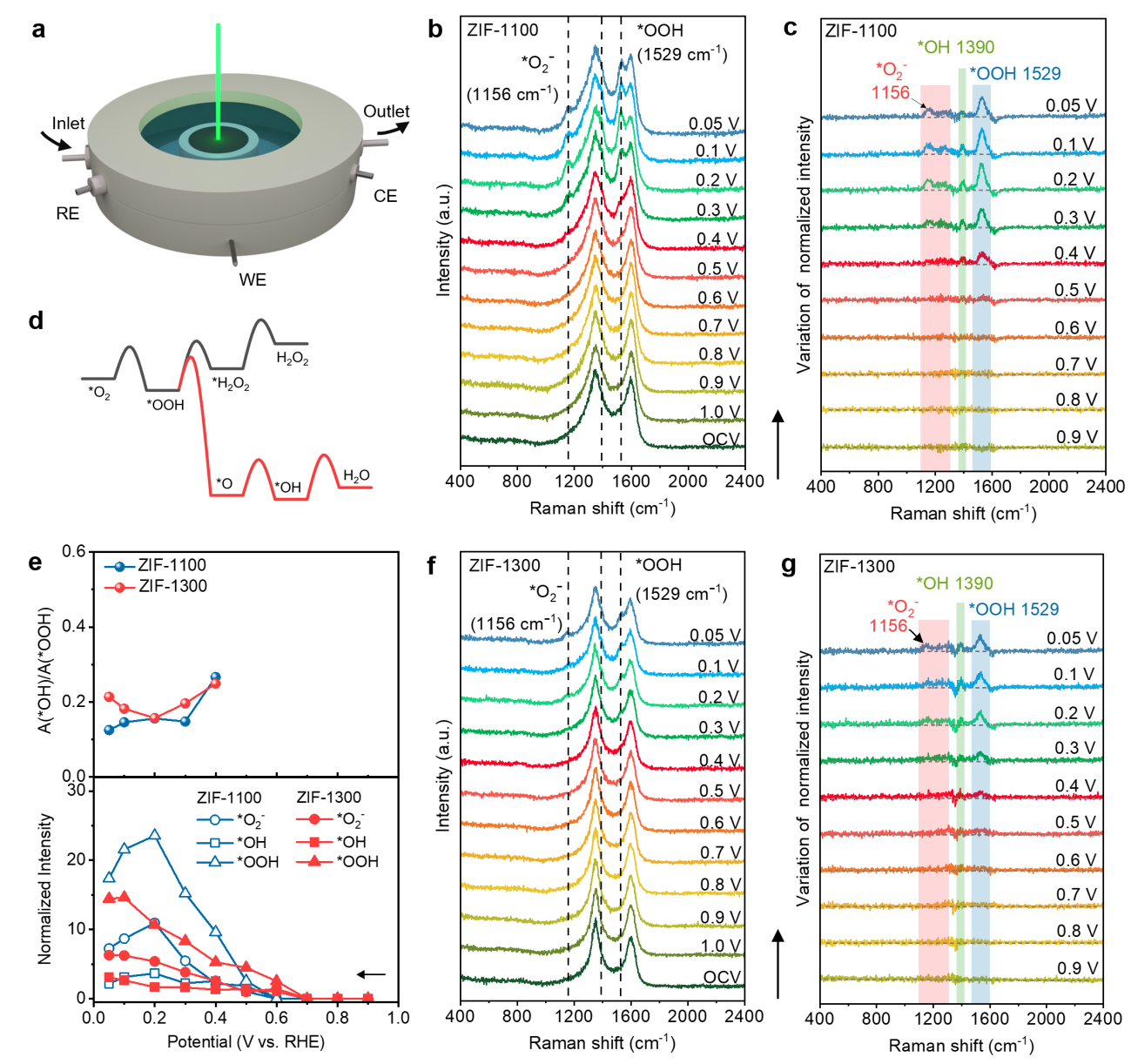 为了在分子尺度上理解其四电子ORR催化机制,研究团队进一步采用原位电化学拉曼光谱(图4)研究了不同电位下催化剂表面形成的ORR中间体(*O2⁻、*OOH、*OH)。其中*O2⁻、*OOH为发生两电子(还原生成H2O2)和四电子(还原生成H2O)途径的共同中间体,尤其是*OOH的累积将显著提高发生两电子途径的概率;而*OH是四电子反应的特征中间体。原位拉曼光谱结果表明,具有五元环石墨氮的催化剂(ZIF–1300)表面产生ORR中间体的过电位更小、且*OH中间体与*OOH中间体的强度比更高,表明其四电子ORR的催化活性和选择性更好。