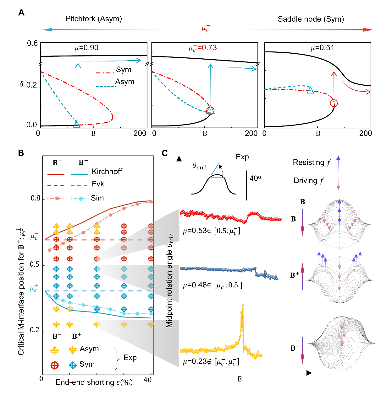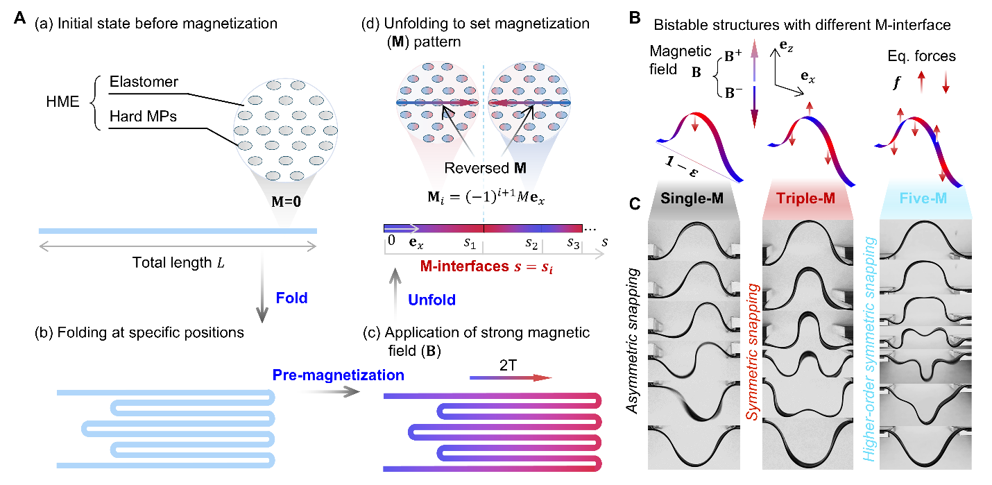 针对这一挑战,AG(中国)AG·官方网页版航天航空学院张迎超副研究员、力学与工程交叉研究院高华健院士和俞璟副教授联合其他研究者创新性地引入了“磁化界面”(M-interfaces)设计理念,在硬磁弹性体结构中预设交替磁化区域,使结构在外加磁场作用下形成一系列方向交错的等效力对(图1)。该构型在保持系统本征对称性的基础上,构建了内部“力场博弈机制”:驱动力诱导结构发生突跳失稳,等效阻力则有效抑制非对称模态的生成。借助这一“分布式调控”策略,研究团队首次在准静态条件下实现了对称性突跳失稳路径的稳定激发,并建立了适用于更复杂双稳系统的通用设计方法。