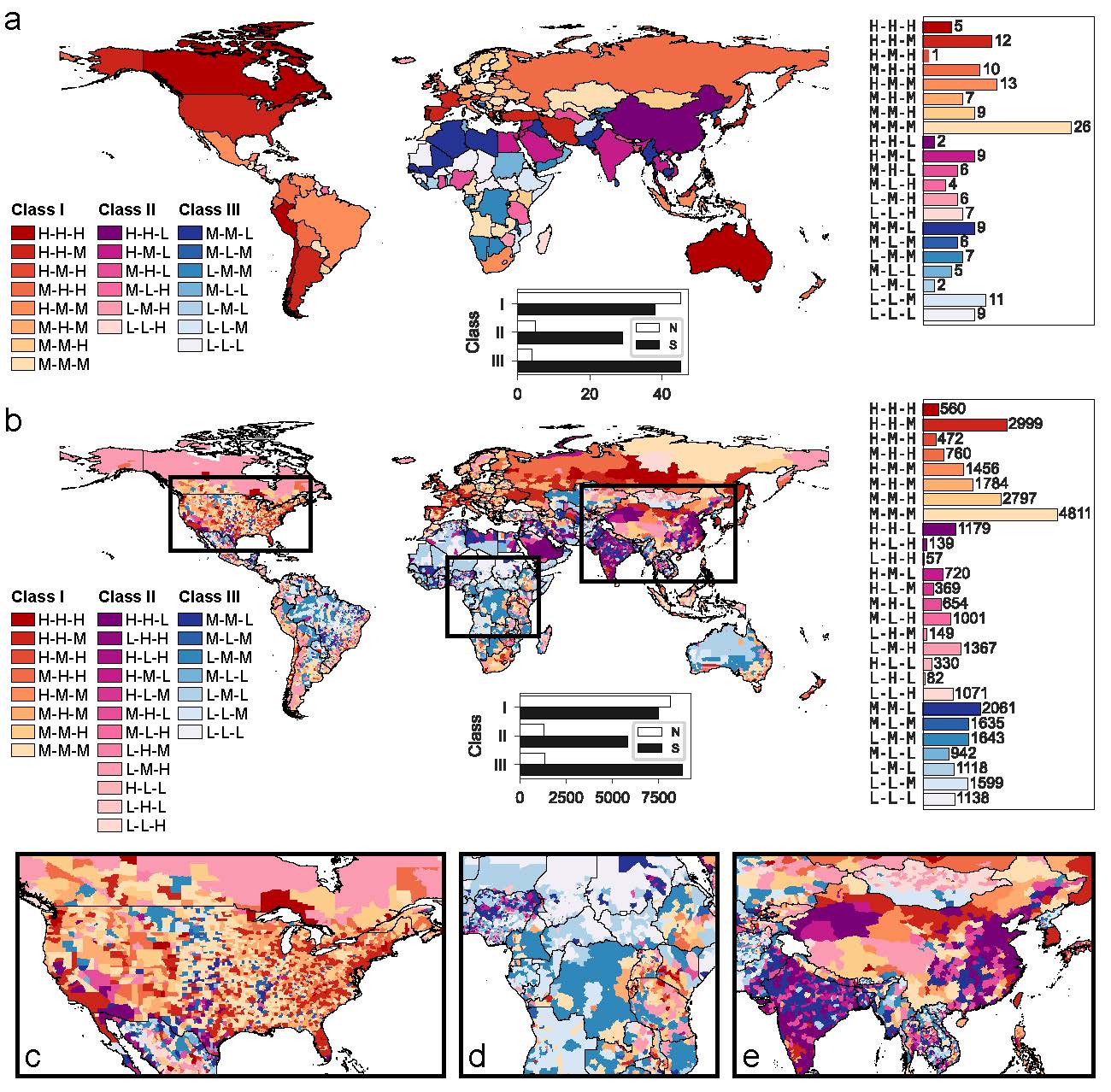 图3.国家(a)和县域(b)尺度的基础设施可达性复合地图。(c-e)为北美、非洲和亚洲县域尺度的基础设施可达性复合地图