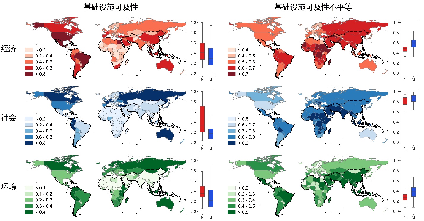 图2.国家尺度经济、社会和环境基础设施的可及性及不公平程度地图。右侧的箱型图展示了全球北方(N)和全球南方(S)国家之间的差异