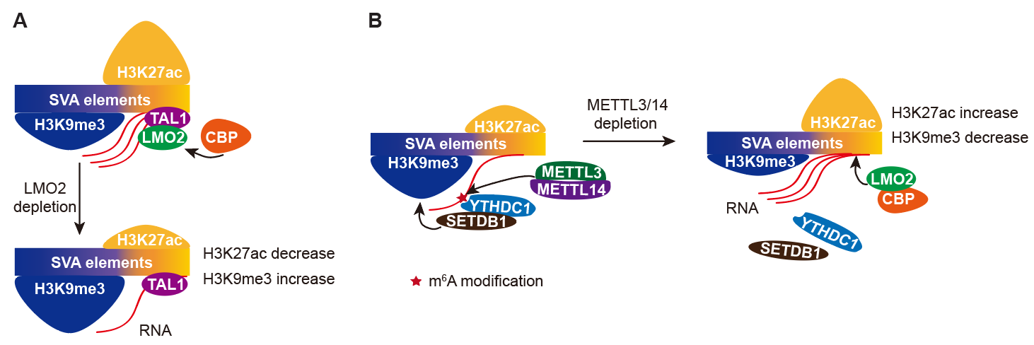为了探究二价染色质对于复合型转座子的调控机理和生物学功能,研究人员以代表性的复合型转座子SVA为研究对象。首先,通过构建SVA的表达报告系统并运用全基因组筛选策略,研究人员找出了SVA的161个抑制因子和237个激活因子,这些调控因子涉及功能多样的调控通路和蛋白互作网络。通过流式和RNA-seq,研究人员验证了其中部分调控因子,并且分析发现具有二价染色质修饰的SVA更倾向于被调控因子所调节。接着,研究人员选取了其中的激活因子LMO2和抑制因子METTL3/14进行了深入探究。结果显示(图2),LMO2通过TAL1结合到SVA的3’端,并招募组蛋白乙酰转移酶CBP在SVA的3’端加上H3K27ac。当LMO2敲除后,SVA的3’端H3K27ac减少,而5’端H3K9me3增加,从而导致SVA表达下调。相反,METTL3/14通过在SVA的RNA上加上m6A修饰,进而招募YTHDC1/SETDB1,在SVA的5’端加上H3K9me3,METTL3/14敲除后,SVA的5’端H3K9me3减少,而3’端LMO2、CBP富集增加,进而使H3K27ac增加,SVA表达升高。