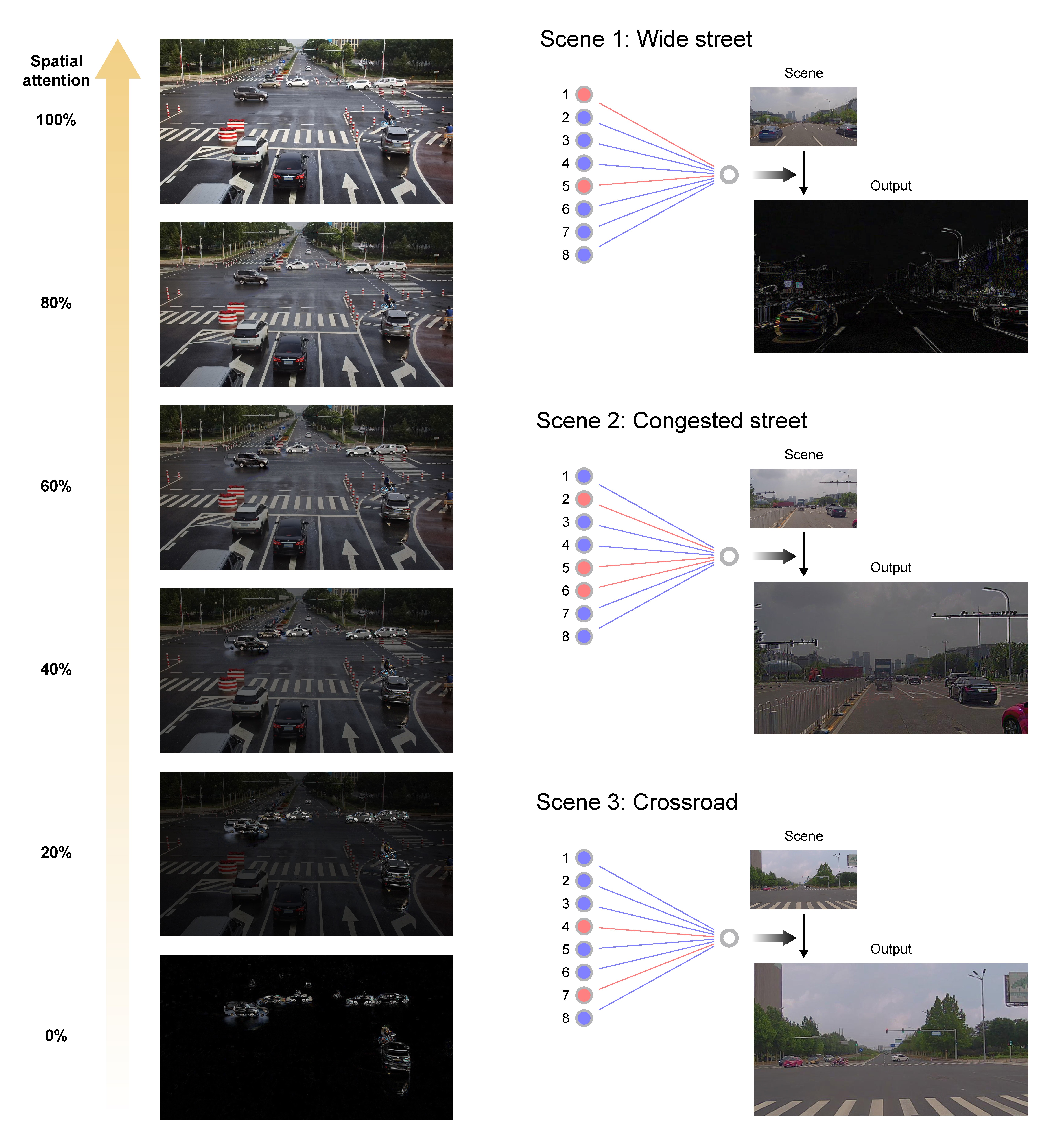 所提出的信息处理范式可用于需要低功耗、实时处理的边缘智能场景。研究团队仿真验证了所提出的信息处理范式在自动驾驶场景中的应用可行性。如图4所示,基于注意力启发器件阵列的路侧设备和车端设备在面对不断变化的环境时,能够实现全范围(0−100%)注意力分配,并能够根据当前的情境实时优化注意力分配,动态调整时间和空间信息的响应强度。