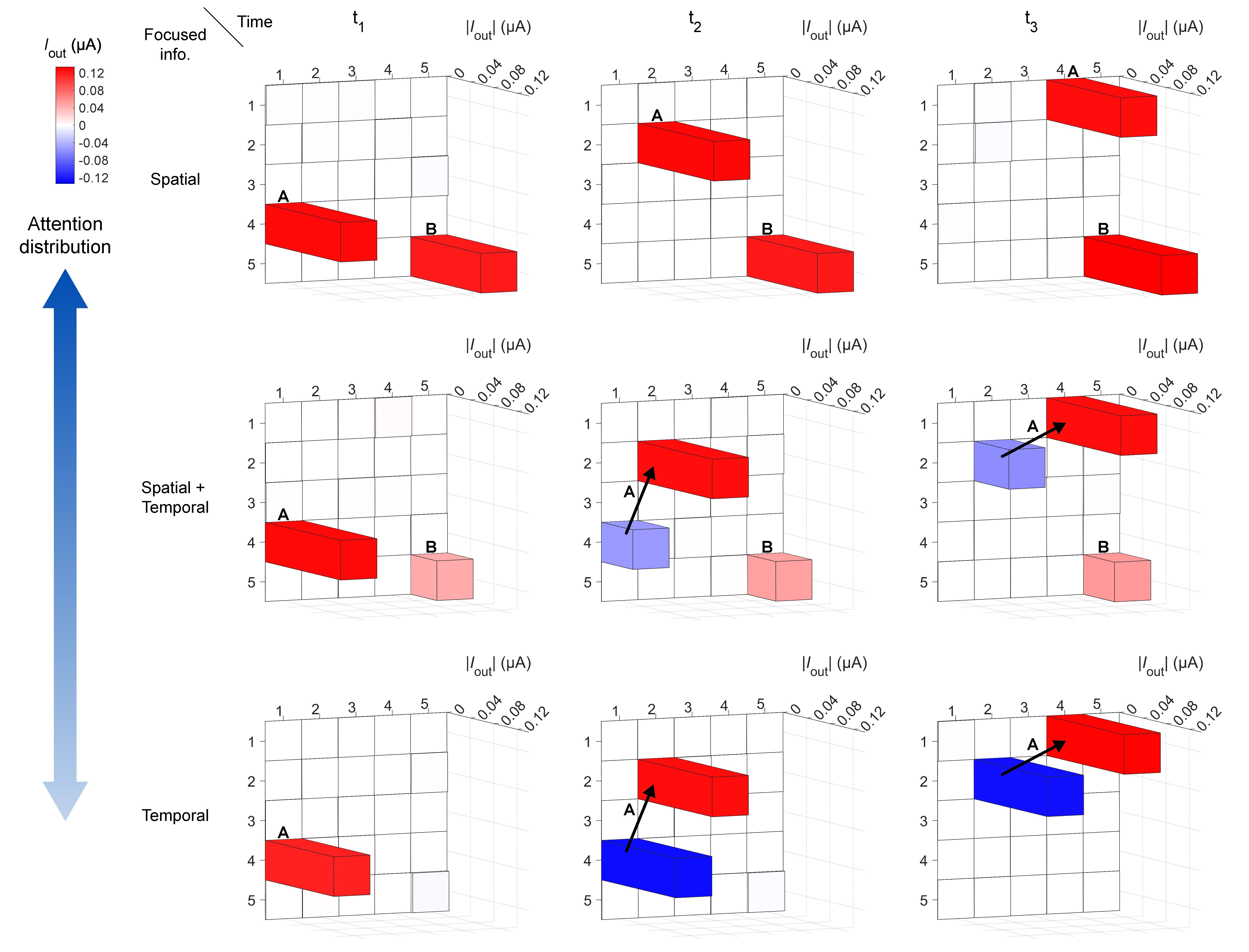 为了验证这一信息处理范式的规模化制造潜力,研究团队制造了5×5单元的注意力启发器件阵列,并实验测试了阵列的适应性时空信息处理功能。如图3所示,图中A点为运动物体,B点为静止物体;图中展示的时间信息包括运动方向等,空间信息包括物体坐标等。t1−t3为连续的3个时刻。注意力的数值由器件的控制栅电压决定,通过调节注意力的数值,改变输出信号中时间和空间信息的响应强度。
