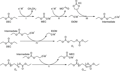 图4.钠离子/钾离子电池碳酸酯类电解液条件下石墨负极SEI形成的反应路径