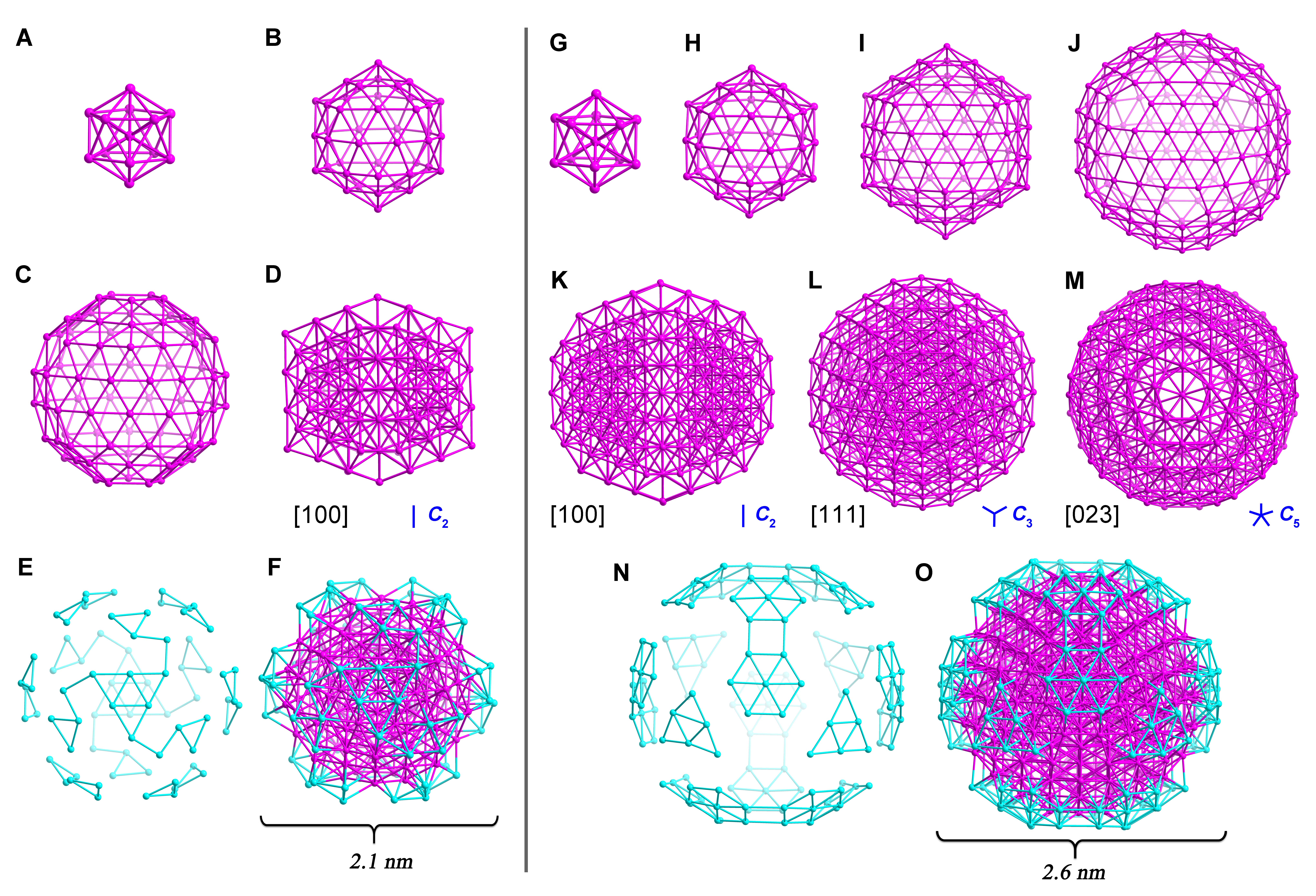 图1.Ag213(A-F)与Ag429(G-O)的结构解析。(A)中心为Ag13的内层二十面体;(B)第二层Ag42二十面体;(C)第三层Ag86二十面体;(D)沿C2对称轴观察的二十面体Ag141核心;(E)最外层Ag72壳层;(F)Ag213内核结构(蓝色标注最外层Ag72);(G)中心为Ag13的内层二十面体;(H)第二层Ag42二十面体;(I)第三层Ag92二十面体;(J)第四层Ag150二十面体;(K-M)分别沿C2、C3、C5轴观察的Ag297二十面体;(N)最外层Ag132壳层;(O)Ag429内核整体结构(蓝色标注最外层Ag132)