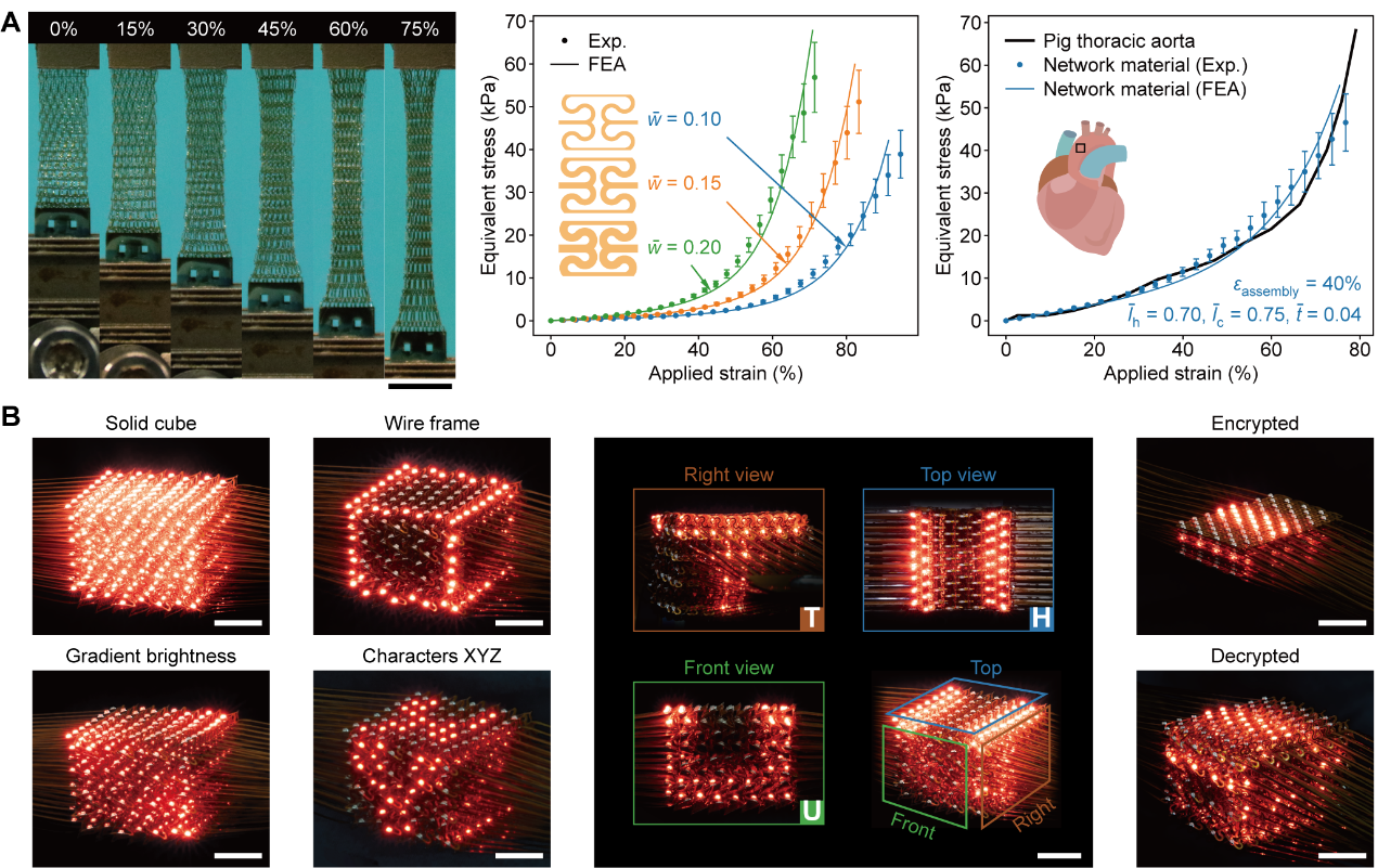 图2.A图为三维网状材料的仿生力学性能(比例尺5mm);B图为拉伸屈曲组装方法制造的体三维显示器件(比例尺1cm)