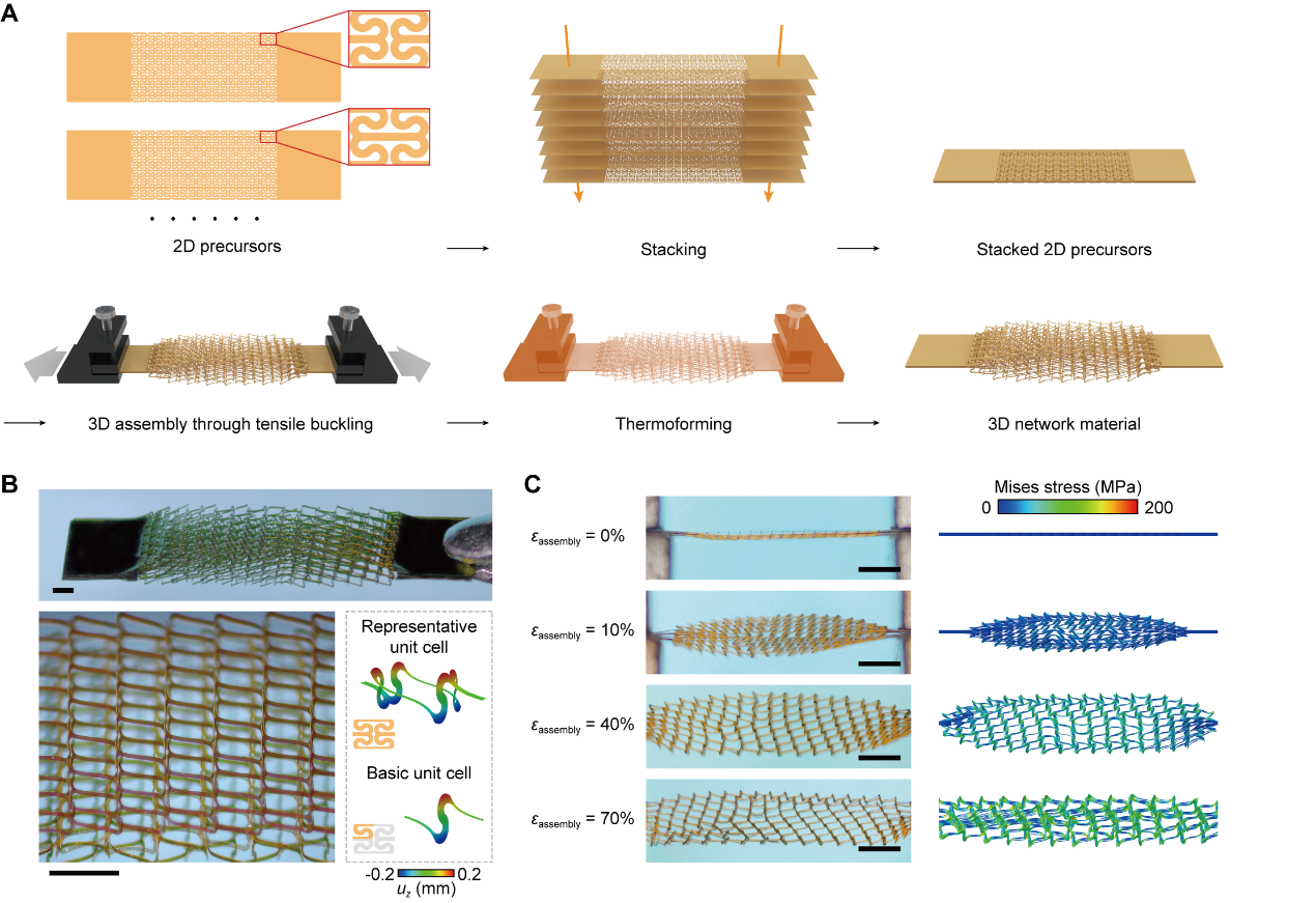 图1.拉伸屈曲驱动的三维网状材料组装方法。A图为组装方法示意;B图为组装制造的三维网状材料光学照片(比例尺1mm);C图为拉伸屈曲组装过程(比例尺2mm)