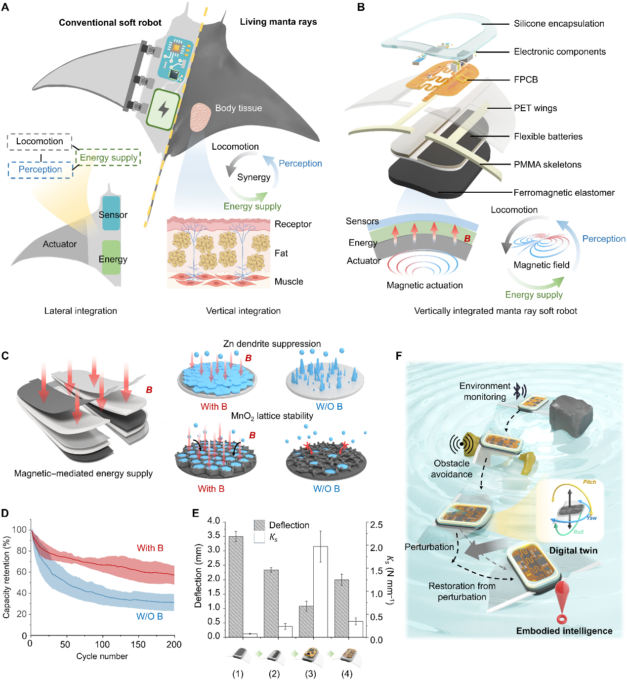 近日,AG(中国)AG·官方网页版深圳国际研究生院丁文伯副教授所在的智能感知与机器人(Smart Sensing and Robotics, SSR)课题组与周光敏副教授课题组合作提出了一种磁驱动柔性电池集成机器人。该机器人集成的抗形变柔性电池,在机器人固有磁场增强下表现出优异性能,在200次循环后的容量保持率具有57.3%。这种柔顺电池可在机器人本体上实现44.9%的大面积部署,并通过与合理设计的柔性混合电路进行垂直集成,在保持可变形性的同时将额外刚度降至最低。这种执行器–电池–传感器的柔性垂直集成方法最大化了功能区域的利用率,并在仿鳐鱼软体机器人中得以实现,从而构建了一个具备感知、通信和稳定供能能力的无束缚平台。该系统在水下环境中展示了具身智能,包括扰动修正、避障和温度监测等多样化功能,并通过本体感知与环境感知实现了磁驱动运动过程中的实时决策。