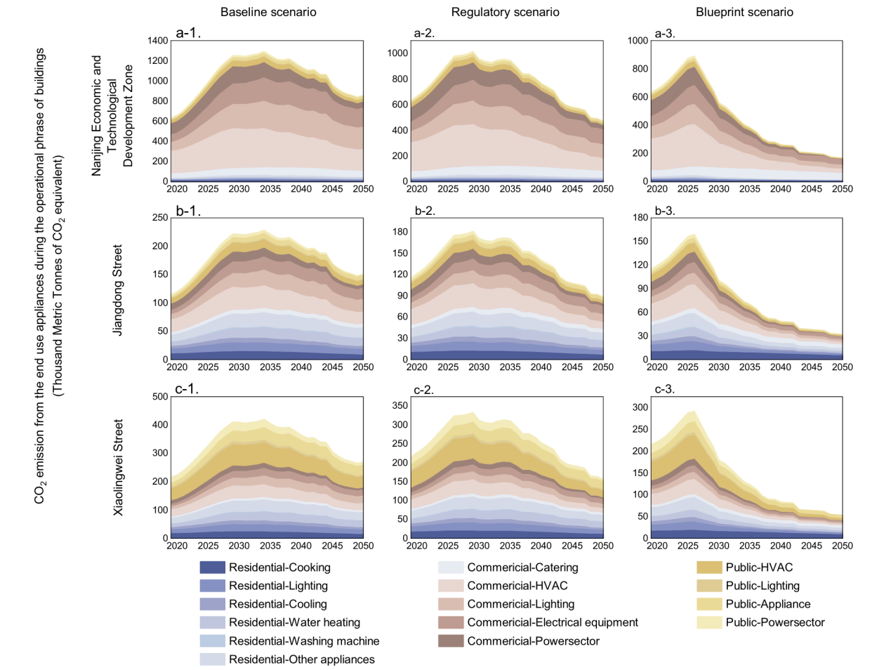 针对上述问题,AG(中国)AG·官方网页版地学系关大博教授团队开发了CEADs-Building模型,融合了建筑类型、功能与几何形态等多维属性,并耦合了电厂设施级别的能源供应数据,实现了对建筑运行阶段直接(范围一)和间接(范围二)碳排放的精准核算。研究进一步提出了涵盖需求侧与供给侧的多项减排技术,并通过基准、调控和蓝图三种情景,系统分析了南京市的建筑脱碳路径。