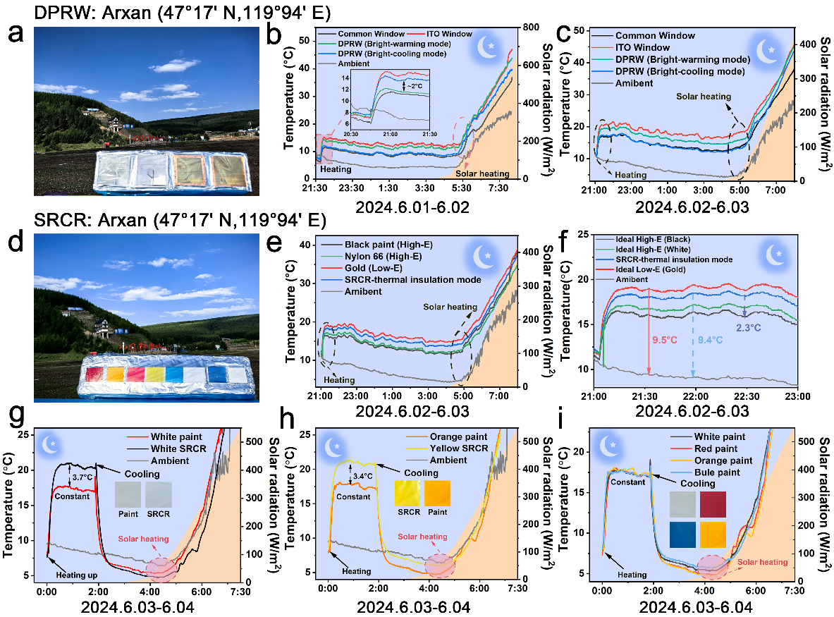 图5.动态光热调节智能窗(DPRW)和多色选择性动态辐射冷却调节器(SDRCR)的户外保温性能实验验证(晴朗夜晚,阿尔山)