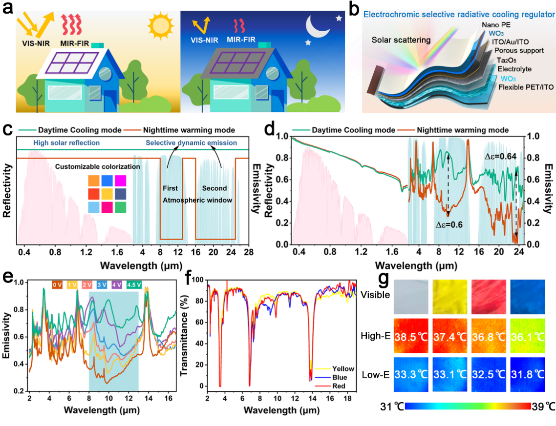 针对建筑的墙体与屋顶等非透明围护结构,张如范团队研制了多色选择性动态辐射冷却调节器。该调节器利用磁控溅射制备的纳米晶三氧化钨薄膜,可在中红外波段的两个关键大气窗口波段实现高选择性的发射率动态调控。通过在0-4.5V电压下进行调节,可实现从制冷态到保温态的平滑过渡。此外,该调节器的顶层采用彩色红外透明聚乙烯膜,使器件在呈现蓝、粉、绿等多种颜色的同时,不影响红外动态调控功能,成功兼顾了建筑美学与节能效能。