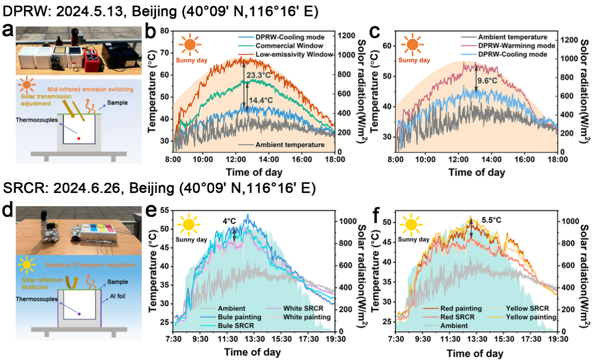 图4.动态光热调节智能窗(DPRW)和多色选择性动态辐射冷却调节器(SDRCR)的动态温度调节户外实验验证(晴天,北京)