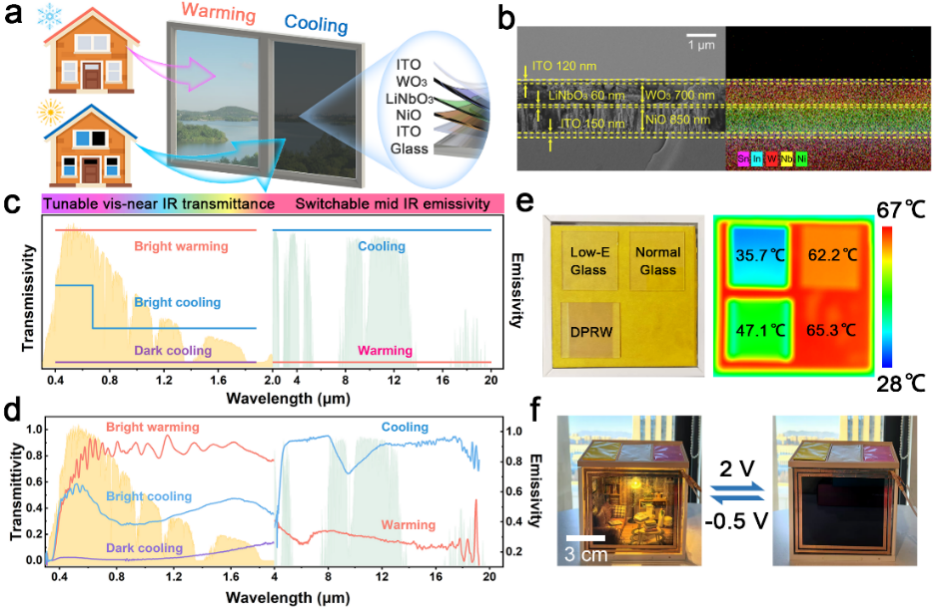 针对建筑的窗户等透明围护结构,张如范团队开发了动态光热调控智能窗。该智能窗采用全薄膜电致变色器件结构,能够在不同电压下实现“明亮-保温”“明亮-制冷”“黑暗-制冷”等多种工作模式的快速切换,其对可见光与近红外波段透射率的调制范围分别高达92%与82%,可有效控制进入室内的光线与热量。通过独特的表面发射率翻转设计,该智能窗的发射率可在高值(约0.9,用于辐射制冷)与低值(约0.28,用于辐射保温)之间转换,红外热像图显示两者温差高达20℃。在北京夏季的户外测试中,该智能窗的制冷模式可使室内温度比普通商业窗户低约14℃,展现出优异的降温能力。
