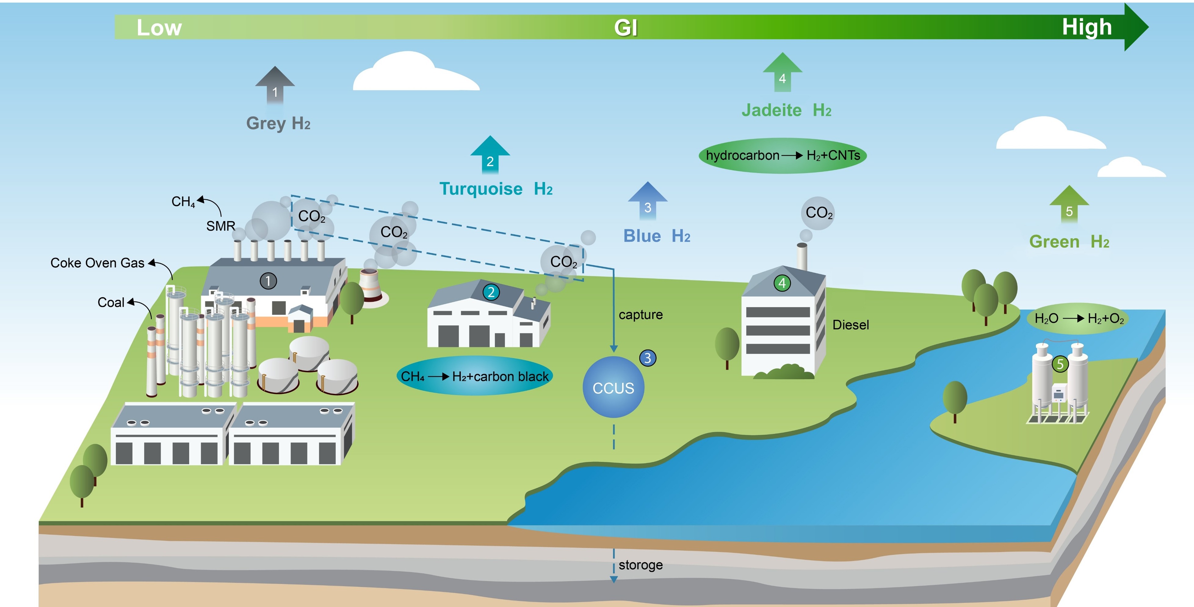 按照GI值从低到高排序的不同制氢路线