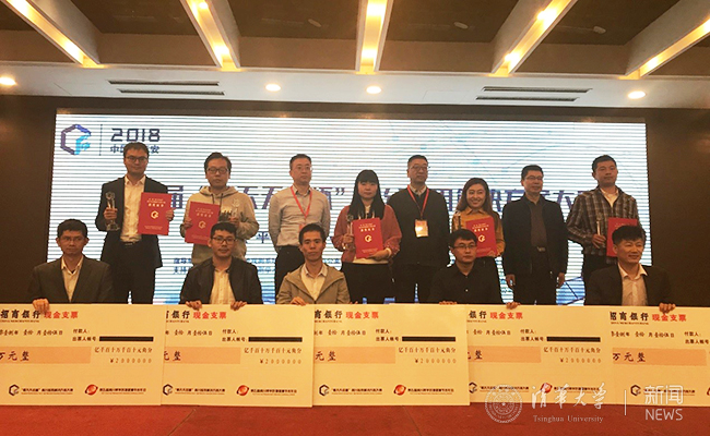 获奖团队领取荣誉证书、奖杯和奖金(后排右三为康婧、前排右二为甄茂成)