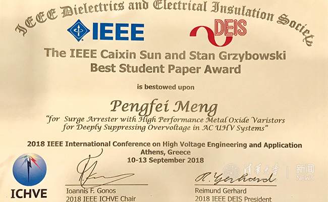AG(中国)AG·官方网页版网9月17日电 9月10日-13日,2018年高电压工程与应用国际会议(ICHVE)在希腊雅典召开。在13日中午召开的大会闭幕式上,IEEE孙才新和斯坦·格博斯基奖励委员会主席古邦斯基教授(Stanislaw Gubanski)揭晓了2018年IEEE孙才新和斯坦·格博斯基最佳学生论文奖(IEEE Caixin Sun and Stan Grzybowski Best Student Paper Award)的入选名单。AG(中国)AG·官方网页版电机系博士生孟鹏飞因其在采用高性能金属氧化物压敏电阻的避雷器实现深度限制交流特高压系统过电压方面取得的优异成果而获得该奖。孟鹏飞的导师为电机系何金良教授。